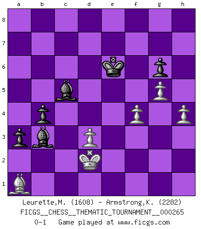 Last move : 0-1 2024 June 20 17:2:8 [Event "FICGS__CHESS__THEMATIC_TOURNAMENT__000265"] [Site "FICGS"] [Date "2024.05.20"] [Round "1"] [White "Leurette,Marc-Antoine"] [Black "Armstrong,Keith"] [Result "0-1"] [WhiteElo "1608"] [BlackElo "2282"] 1.e4 e5 2.Nf3 Nc6 3.Bc4 Nf6 4.Ng5 d5 5.exd5 Nxd5 6.Nxf7 Kxf7 7.Qf3+ Ke6 8.Nc3 Ncb4 9.Bb3 c6 10.a3 Na6 11.O-O Qf6 12.Bxd5+ cxd5 13.Qxd5+ Ke7 14.Ne4 Qe6 15.Qd3 Bd7 16.b4 Re8 17.Bb2 Kd8 18.Rae1 Qg6 19.b5 Nc5 20.Nxc5 Bxc5 21.Qxg6 hxg6 22.a4 Rh4 23.Bxe5 Rxa4 24.Bxg7 Bxb5 25.d3 Rxe1 26.Rxe1 Ra2 27.Re2 Ba4 28.g3 Rxc2 29.Kf1 Rxe2 30.Kxe2 b5 31.h4 Bb3 32.f4 a5 33.g4 Ke7 34.g5 Ke6 35.Kd2 a4 36.Bb2 a3 37.Ba1 b4 0-1 Follow this game move after move (download)Chess mastery essentially consists of analyzing Chess positions accurately. (Mikhail Botvinnik) Meine Liebe ist Schach, Schach, Schach. Ich muss jeden Tag Schach spielen, deshalb fühle ich mich so stark. (Miguel Najdorf) No soy una persona materialista y por eso, no resiento la falta o pérdida del dinero. La ausencia de cosas mundanas carece de importancia. Ya que el Ajedrez es una forma en la que puedo ser tan materialista como yo desee sin tener la necesidad de vender mi alma. (Jamie Walter Adams) La guerre est enfant de la passion, la passion est enfant du narcissisme et le narcissisme est l'enfant. (...) Une autre partie ? (Thibault de Vassal) True nature is revealed in times of difficulty. (Chinese proverb)