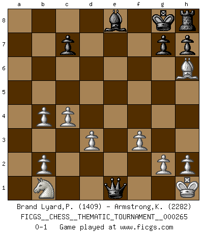 Last move : 0-1 2024 June 3 8:48:41 [Event "FICGS__CHESS__THEMATIC_TOURNAMENT__000265"] [Site "FICGS"] [Date "2024.05.20"] [Round "1"] [White "Brand Lyard,Paul"] [Black "Armstrong,Keith"] [Result "0-1"] [WhiteElo "1409"] [BlackElo "2282"] 1.e4 e5 2.Nf3 Nc6 3.Bc4 Nf6 4.Ng5 d5 5.exd5 Nxd5 6.Nxf7 Kxf7 7.Qh5+ Kg8 8.O-O Be6 9.Re1 Qd7 10.Bxd5 Bxd5 11.d3 Be7 12.c4 Bf7 13.Qf3 Rd8 14.Rd1 Nd4 15.Qxb7 Nc2 16.Qxa7 Nxa1 17.Qe3 Nc2 18.Qxe5 Bb4 19.a3 Re8 20.Qxe8+ Bxe8 21.Bh6 Qg4 22.f3 Qd4+ 23.Kh1 Qf2 24.axb4 Ne1 25.Rxe1 Qxe1+ 0-1 Follow this game move after move (download)The tactician knows what to do when there is something to do; whereas the strategian knows what to do when there is nothing to do. (Gerald Abrahams) Mit sehr nachdenklichem Gesicht schreitet Bobby durch den Turniersaal. Was ist passiert?, fragt Lombardy. Ich stehe schlecht, antwortet Fischer. Lombardy: Dann biete doch einfach Remis an. Fischer: So schlecht stehe ich nun auch wieder nicht! (Robert James Fischer) Un sacrificio se refuta mucho mejor al aceptarlo. (Wilhelm Steinitz) Lorsque vous vous retrouvez devant une position atroce, ne tendez pas un ultime piège dérisoire avec l'intention d'abandonner si l'adversaire le déjoue ! Faites-vous plutôt un devoir de résister comme si votre vie en dépendait. Jouez le coup qui vous déplairait au centuple si vous étiez dans la peau de votre tortionnaire ! Unless I accept my faults I will most certainly doubt my virtues. (Hugh Prather)