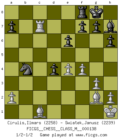 Last move : 1/2-1/2 2024 July 18 17:5:53 [Event "FICGS__CHESS__CLASS_M__000138"] [Site "FICGS"] [Date "2024.05.29"] [Round "1"] [White "Cirulis,Ilmars"] [Black "Swiatek,Janusz"] [Result "1/2-1/2"] [WhiteElo "2258"] [BlackElo "2239"] 1.f4 d5 2.e3 Bf5 3.Nc3 e6 4.Nf3 Be7 5.d3 Nf6 6.g3 h6 7.Bg2 Bh7 8.O-O O-O 9.Kh1 c5 10.e4 dxe4 11.Ne5 Nd5 12.dxe4 Nxc3 13.bxc3 Qxd1 14.Rxd1 Bf6 15.Nc4 Bxc3 16.Rb1 Nc6 17.Rxb7 Rad8 18.Nd6 Nb4 19.Rc7 Bd4 20.c3 Rxd6 21.cxd4 Rxd4 22.Rxd4 cxd4 1/2-1/2 Follow this game move after move (download)Every Pawn is a potential Queen. (James Mason) Schach wird sich dank seiner hohen kulturellen Tradition immer durchsetzen. In näherer Zukunft womöglich sogar als Gegenreaktion auf die maßlose Reizüberflutung im Freizeit- und Spielbereich. (Garry Kasparov) El Ajedrez es como la guerra en un tablero. (Bobby Fischer) Les échecs sont plus proches de l'art de l'assassinat que de l'art de la guerre. (Arturo Perez-Reverte) It's not the size of the dog in the fight, it's the size of the fight in the dog. (Mark Twain)