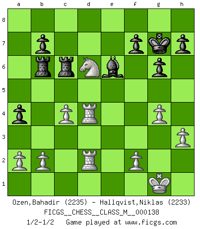 Last move : 1/2-1/2 2024 June 15 9:1:14 [Event "FICGS__CHESS__CLASS_M__000138"] [Site "FICGS"] [Date "2024.05.29"] [Round "1"] [White "Ozen,Bahadir"] [Black "Hallqvist,Niklas"] [Result "1/2-1/2"] [WhiteElo "2235"] [BlackElo "2233"] 1.Nf3 c5 2.c4 g6 3.e4 Nc6 4.d4 cxd4 5.Nxd4 d6 6.Nc3 Nf6 7.Be2 Nxd4 8.Qxd4 Bg7 9.Be3 O-O 10.Qd2 a5 11.O-O a4 12.Bd4 Qa5 13.Qe3 Ng4 14.Bxg4 Bxd4 15.Qxd4 Bxg4 16.e5 Be6 17.exd6 exd6 18.Rad1 Qc5 19.Ne4 Qxd4 20.Rxd4 Ra6 21.Rfd1 Rb6 22.R1d2 Rc8 23.Nxd6 R8c6 24.h3 Kg7 25.g4 1/2-1/2 Follow this game move after move (download)Is Bobby Fischer quite sane ? (Salo Flohr) Ich suche im Schach immer etwas Eigenes. Riskantes Spiel im Stile schachlicher Musketiere ist nicht meine Sache, auch wenn es vielen Freunden scharfer Wendungen gefällt. (Anatoly Karpov) Una mala movida nulifica cuarenta buenas. (Horowitz) Karpov est une pièce de musée. (Garry Kasparov) The only thing that overcomes hard luck is hard work. (Harry Golden)