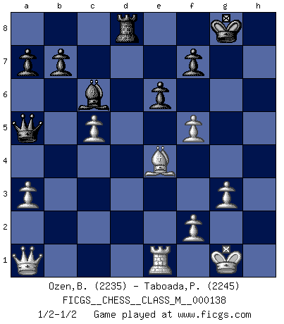 Last move : 1/2-1/2 2024 August 8 21:5:53 [Event "FICGS__CHESS__CLASS_M__000138"] [Site "FICGS"] [Date "2024.05.29"] [Round "1"] [White "Ozen,Bahadir"] [Black "Taboada,Pedro Pablo"] [Result "1/2-1/2"] [WhiteElo "2235"] [BlackElo "2245"] 1.Nf3 d5 2.d4 Nf6 3.c4 e6 4.Nc3 Be7 5.Bf4 O-O 6.e3 c5 7.dxc5 Bxc5 8.a3 Nc6 9.Qc2 Qa5 10.Rd1 Be7 11.Be2 dxc4 12.Bxc4 Nh5 13.O-O Nxf4 14.exf4 Qc7 15.g3 Bd7 16.Rfe1 Rad8 17.h4 Bf6 18.Bd3 g6 19.h5 Bg7 20.Ne4 Qb6 21.b4 Nd4 22.Nxd4 Bxd4 23.Nc5 Bc6 24.hxg6 hxg6 25.Bxg6 Bxc5 26.bxc5 Qa5 27.Bh7+ Kg7 28.Be4 Rxd1 29.Qxd1 Rd8 30.Qa1+ Kg8 31.f5 1/2-1/2 Follow this game move after move (download)What is the difference between chess and football? Everybody understands football, but nobody plays it. Everybody plays chess, but nobody understands it. Everything is relative. (Vladimir Kramnik) Weshalb minderdergeübte Spieler mit g2-g4 beginnen? Die betreffenden sind unschlüssig, ob sie nun rechts (h4) oder links (f4) beginnen sollen, und in ihrer Ratlosigkeit entschliessen sie sich nach guter Bürgerart dazu, den goldenen Mittelweg zu wählen. (Aaron Nimzowitsch) Desconfianza es la característica mas necesaria de un jugador de Ajedrez. (Siegbert Tarrasch) Aidez vos pièces, elles vous aideront. (Paul Morphy) The beginning is the most important part of the work. (Plato)