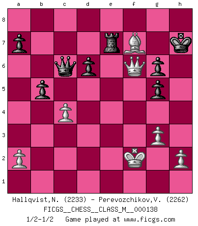 Last move : 1/2-1/2 2024 June 24 23:26:29 [Event "FICGS__CHESS__CLASS_M__000138"] [Site "FICGS"] [Date "2024.05.29"] [Round "1"] [White "Hallqvist,Niklas"] [Black "Perevozchikov,Vjacheslav"] [Result "1/2-1/2"] [WhiteElo "2233"] [BlackElo "2262"] 1.d4 e6 2.c4 Bb4+ 3.Bd2 Qe7 4.g3 Nc6 5.e3 Bxd2+ 6.Nxd2 e5 7.d5 Nb8 8.Bg2 f5 9.e4 d6 10.Nh3 Nf6 11.exf5 Bxf5 12.Qf3 g6 13.O-O Nbd7 14.Qc3 O-O 15.Rae1 Rae8 16.Ng5 b6 17.f4 Qg7 18.Ndf3 Nc5 19.fxe5 Ng4 20.Nd4 Nxe5 21.b4 h6 22.bxc5 hxg5 23.cxd6 cxd6 24.Ne6 Bxe6 25.dxe6 Rxf1+ 26.Rxf1 Qc7 27.Bd5 Qc5+ 28.Kg2 b5 29.e7 Kh7 30.Rf7+ Nxf7 31.Bxf7 Rxe7 32.Qf6 Qc6+ 33.Kf2 Qc5+ 34.Kg2 Qc6+ 35.Kf2 1/2-1/2 Follow this game move after move (download)Every Chess master was once a beginner. (Chernev) Bis zum Jahr 1971 verlief in meiner Schachkariere alles glatt. Dieses dramatische Match [Fischer-Taimanov 6:0] machte mein Leben zur Hölle. (Mark Taimanov) Solo existe una cosa que Fischer hace en el Ajedrez sin placer: ¡perder!. (Boris Spassky) On peut tirer plus d'utilité d'une partie perdue que de 100 parties gagnées. (Capablanca) They misunderestimated me. (George W. Bush, Bentonville nov. 6, 2000)