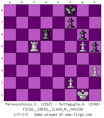 Last move : 1/2-1/2 2024 October 6 10:53:39 [Event "FICGS__CHESS__CLASS_M__000138"] [Site "FICGS"] [Date "2024.05.29"] [Round "1"] [White "Perevozchikov,Vjacheslav"] [Black "Duttagupta,Aniruddha"] [Result "1/2-1/2"] [WhiteElo "2262"] [BlackElo "2248"] 1.Nf3 g6 2.d4 Bg7 3.Bf4 Nf6 4.c4 c5 5.d5 b5 6.cxb5 a6 7.bxa6 Qb6 8.Nc3 d6 9.Rb1 O-O 10.e4 Bxa6 11.Bd3 Bxd3 12.Qxd3 Qa6 13.Qxa6 Rxa6 14.O-O Nbd7 15.h3 Rb8 16.g4 Nb6 17.Rfe1 h5 18.g5 Nfd7 19.e5 Nc4 20.exd6 exd6 21.Re4 Bxc3 22.Rxc4 Rxb2 23.Rxb2 Bxb2 24.Re4 Kf8 25.a4 Ne5 26.Nxe5 dxe5 27.Bxe5 Bxe5 28.Rxe5 Rxa4 29.d6 Rd4 30.Rxc5 Rxd6 1/2-1/2 Follow this game move after move (download)It's just you and your opponent at the board and you're trying to prove something. (Bobby Fischer) Ich liebe den Moment, wenn ich das Ego meines Gegenüber breche. (Robert James Fischer) El Ajedrez es de 30 a 40 por ciento psicología. Uno no cuenta con esto cuando se juega contra una computadora. No lo puedo confundir. (Judith Polgar) Vous m'avez demandé de vous exposer quel est le fondement de la prière. Je ne fais que préparer les pièces du jeu sur la table... Nous sera-t-il permis d'en adopter les règles et si nous les appliquons scrupuleusement nous ne tarderons pas à faire mat le Roi divin ! Il ne pourra échapper à nos mains. (Sainte Thérèse d'Avila, Chemin de perfection) Do not put your faith in what statistics say until you have carefully considered what they do not say. (William W. Watt)