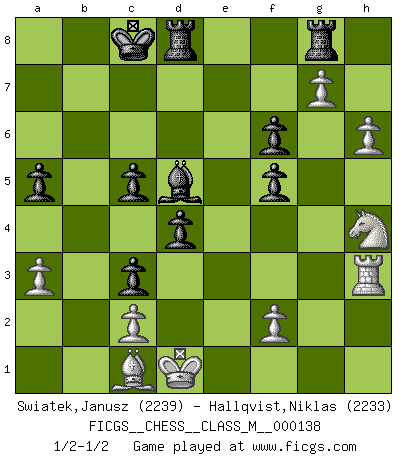 Last move : 1/2-1/2 2024 August 10 8:22:10 [Event "FICGS__CHESS__CLASS_M__000138"] [Site "FICGS"] [Date "2024.05.29"] [Round "1"] [White "Swiatek,Janusz"] [Black "Hallqvist,Niklas"] [Result "1/2-1/2"] [WhiteElo "2239"] [BlackElo "2233"] 1.e4 e6 2.d4 d5 3.Nc3 Bb4 4.e5 c5 5.a3 Bxc3+ 6.bxc3 Ne7 7.h4 Qc7 8.Rb1 b6 9.h5 h6 10.Qg4 cxd4 11.Qxg7 Rg8 12.Qxh6 Qxe5+ 13.Kd1 dxc3 14.Nf3 Qh8 15.Qxh8 Rxh8 16.h6 Nd7 17.Bb5 f6 18.g4 Bb7 19.g5 d4 20.Rh3 O-O-O 21.Rb4 Nf5 22.Bd3 a5 23.Rc4+ Nc5 24.Bxf5 exf5 25.g6 Bd5 26.g7 Rhg8 27.Rxc5+ bxc5 28.Nh4 1/2-1/2 Follow this game move after move (download)Some sacrifices are sound; the rest are mine. (Mikhail Tal) Strategie ist, wie man ein Mädchen auf den Rücksitz bekommt. Taktik ist, was man tut, wenn man dann dort ist. (Anonymous) Una buena memoria, concentración, imaginación y una fuerte voluntad, se requiere para llegar a ser un buen jugador. (Bobby Fischer) RxDa4 pat (...) Wisdom doesn't necessarily come with age. Sometimes age just shows up all by itself. (Tom Wilson)