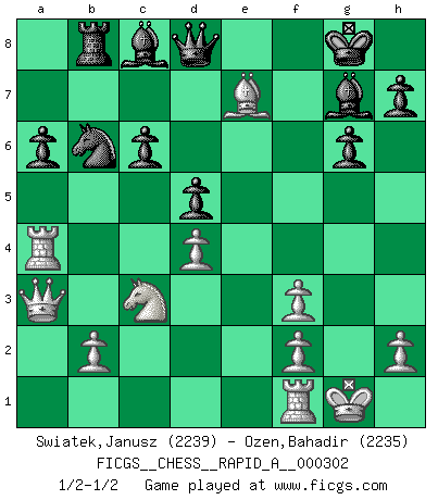 Last move : 1/2-1/2 2024 August 10 7:18:50 [Event "FICGS__CHESS__RAPID_A__000302"] [Site "FICGS"] [Date "2024.06.13"] [Round "1"] [White "Swiatek,Janusz"] [Black "Ozen,Bahadir"] [Result "1/2-1/2"] [WhiteElo "2239"] [BlackElo "2235"] 1.d4 Nf6 2.c4 g6 3.Nc3 d5 4.Nf3 Bg7 5.Qb3 dxc4 6.Qxc4 O-O 7.e4 a6 8.Qb3 b5 9.e5 Nfd7 10.e6 fxe6 11.Be3 Nf6 12.a4 bxa4 13.Rxa4 Nd5 14.Bc4 c6 15.O-O Nd7 16.Bg5 Rxf3 17.gxf3 Rb8 18.Qa3 N7b6 19.Bxd5 exd5 20.Bxe7 1/2-1/2 Follow this game move after move (download)Chess is a more highly symbolic game, but the aggressions are therefore even more frankly represented in the play. It probably began as a war game; that is, the representation of a miniature battle between the forces of two kingdoms. (Karl Meninger) Den Ruhm habe ich schon, jetzt brauche ich noch das Geld. (Wilhelm Steinitz) Debió haber existido una vez en que los hombres eran semidióses, de otra manera no hubiesen podido inventar el Ajedrez. (Gustav Schenk) Je fais ceci parce que dans cinquante coups j'obtiendrai cela; je m'appelle Mikhail Moisevitch Botvinnik. (Botvinnik) Dave, my mind is going. I can feel it. (HAL 9000 in 2001, a space odyssey)