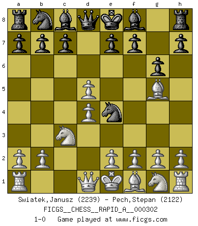 Last move : 1-0 2024 July 22 16:42:57 [Event "FICGS__CHESS__RAPID_A__000302"] [Site "FICGS"] [Date "2024.06.13"] [Round "1"] [White "Swiatek,Janusz"] [Black "Pech,Stepan"] [Result "1-0"] [WhiteElo "2239"] [BlackElo "2122"] 1.d4 Nf6 2.c4 g6 3.Nc3 d5 4.Bg5 Ne4 5.cxd5 1-0 This chess game has been lost on time (started : 2024.06.13 9:37:39) Follow this game move after move (download)Good positions don't win games, good moves do. (Gerald Abrahams) Ein guter Spieler hat immer Glück. (José Raúl Capablanca) Con el tiempo, empecé a progresar en partidas decisivas. Tal vez porque me di cuenta de una simple verdad: no solo estaba yo nervioso sino también mi oponente. (Mikhail Tal) Je crois qu'il existe des manières très spécifiques de jouer efficacement contre une machine. Evidemment, nous n'avons aucune chance en technique pure, parce que l'ordinateur calcule de manière parfaite. Mais lorsque nous faisons appel à notre cerveau, en utilisant l'intuition et la compréhension, alors nous restons beaucoup plus forts. (Anatoli Karpov) Pushing plastic is for the many, pushing virtual pieces is for the fewer, pushing wood is for the very few. (Normajean Yates)