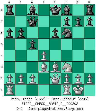 Last move : 0-1 2024 August 1 3:50:12 [Event "FICGS__CHESS__RAPID_A__000302"] [Site "FICGS"] [Date "2024.06.13"] [Round "1"] [White "Pech,Stepan"] [Black "Ozen,Bahadir"] [Result "0-1"] [WhiteElo "2122"] [BlackElo "2235"] 1.e4 e6 2.d4 d5 3.Nc3 dxe4 4.Nxe4 Nd7 5.Nf3 Ngf6 6.Nxf6+ Nxf6 7.Bd3 c5 8.Be3 Qc7 9.Qe2 a6 10.O-O b6 0-1 Follow this game move after move (download)The game of chess is the touchstone of the intellect. (Goethe) Ich erzeugte keinen Neid, da mich die Schachspieler als Musiker und die Musiker als Schachspieler betrachteten. (Mark Taimanov) Nunca antes ha habido un jugador de Ajedrez con tal conocimiento a fondo de las complejidades del juego y una inmensa voluntad absolutamente indomable de ganar. Yo pienso que Fischer es el jugador mas grande que jamás haya existido. (Lisa Lane) La vie est comme un jeu d'échecs : nous esquissons un plan, mais celui-ci est tributaire de ce que daignent faire l'adversaire aux échecs et le destin dans la vie. (Arthur Schopenhauer) Two beer, or not two beer. (Unknown)