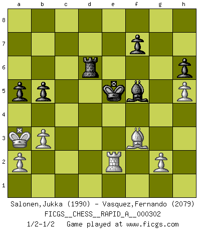 Last move : 1/2-1/2 2024 October 6 11:58:51 [Event "FICGS__CHESS__RAPID_A__000302"] [Site "FICGS"] [Date "2024.06.13"] [Round "1"] [White "Salonen,Jukka"] [Black "Vasquez,Fernando"] [Result "1/2-1/2"] [WhiteElo "1990"] [BlackElo "2079"] 1.d4 Nf6 2.c4 g6 3.Nc3 Bg7 4.e4 d6 5.Nf3 O-O 6.Be2 e5 7.dxe5 dxe5 8.Qxd8 Rxd8 9.Bg5 c6 10.Nxe5 Re8 11.O-O-O Na6 12.Nf3 Nc5 13.Nd2 h6 14.Be3 Nfxe4 15.Ndxe4 Nxe4 16.Nxe4 Rxe4 17.Rd8+ Kh7 18.Bd3 Re5 19.h3 c5 20.h4 Bf6 21.Rd6 Be7 22.Rd5 Rxd5 23.cxd5 Kg7 24.h5 g5 25.f4 gxf4 26.Bxf4 Bg4 27.Re1 Bh4 28.Rf1 Rd8 29.d6 c4 30.Be4 b6 31.Bf3 Be6 32.Kc2 Bg5 33.Bg3 Bf5+ 34.Kc3 Bf6+ 35.Kxc4 Rc8+ 36.Kb4 a5+ 37.Ka3 Bd7 38.Re1 b5 39.Re2 Rc5 40.Bh2 Be6 41.Bg1 Rc4 42.Re4 Rc2 43.Bd4 Rd2 44.Bxf6+ Kxf6 45.Re2 Rxd6 46.b3 Bf5 47.Rf2 Ke5 48.Re2+ 1/2-1/2 Follow this game move after move (download)I love all positions. Give me a difficult positional game, I will play it. But totally won positions, I cannot stand them. (Hein Donner) Kritik überlasse ich den Spießern. Ich zeige nichts, wofür ich mich schämen muss. (Alexandra Kosteniuk) ¿Quién es tu oponente esta tarde? Esta tarde mi oponente son las piezas negras. (Akiba Rubinstein) Des points faibles ou des trous dans la position de l'adversaire doivent être occupés par des pièces et non pas par des pions. (Siegbert Tarrasch) The leaves of memory seemed to make a mournful rustling in the dark. (Henry Wadsworth Longfellow)
