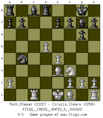 Last move : 0-1 2024 August 1 3:51:27 [Event "FICGS__CHESS__RAPID_A__000302"] [Site "FICGS"] [Date "2024.06.13"] [Round "1"] [White "Pech,Stepan"] [Black "Cirulis,Ilmars"] [Result "0-1"] [WhiteElo "2122"] [BlackElo "2258"] 1.c4 g6 2.d4 Nf6 3.Nc3 d5 4.cxd5 Nxd5 5.e4 Nxc3 6.bxc3 Bg7 7.Nf3 c5 8.Be3 Qa5 9.Qd2 Nc6 10.Rc1 cxd4 11.cxd4 Qxd2+ 12.Kxd2 O-O 13.d5 Rd8 14.Ke1 Nb4 0-1 Follow this game move after move (download)Only the player with the initiative has the right to attack. (Wilhelm Steinitz) Verschiedene, sehr schätzbare und im Laufe des Lebens nützliche Eigenschaften des Geistes können durch das Schachspiel erworben und gekräftigt werden, so dass sie zu Gewohnheiten werden, die uns nie im Stich lassen. (Benjamin Franklin) Cuando le juegas a Fischer, no es una cuestion de si vas a ganar o perder. Es una cuestion de si vas a sobrevivir. (Boris Spassky) Les Echecs ont trois composantes : le temps, l'espace et le matériel en dernier. (Mikhail Tal) Luck never made a man wise. (Seneca, Letters to Lucilius)