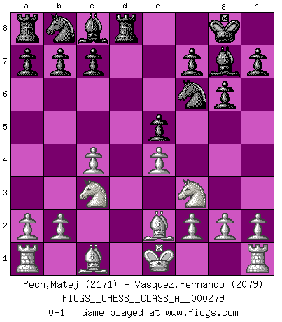 Last move : 0-1 2024 July 31 4:44:4 [Event "FICGS__CHESS__CLASS_A__000279"] [Site "FICGS"] [Date "2024.06.14"] [Round "1"] [White "Pech,Matej"] [Black "Vasquez,Fernando"] [Result "0-1"] [WhiteElo "2171"] [BlackElo "2079"] 1.d4 Nf6 2.c4 g6 3.Nc3 Bg7 4.e4 d6 5.Nf3 O-O 6.Be2 e5 7.dxe5 dxe5 8.Qxd8 Rxd8 0-1 This chess game has been lost on time (started : 2024.06.14 22:41:55) Follow this game move after move (download)When the Chess game is over, the Pawn and the King go back to the same box. (Irish saying) Frage: Wie viele Autos haben Sie schon zerstört? - Antwort: Nur zwei. (Loek van Wely) Un entendimiento a fondo de las continuaciones típicas del mate, hace de las combinaciones de sacrificio mas complicadas conducirlas a ellas no solo sin dificultad, sino casi de una manera natural. (Siegbert Tarrasch) Soyez une menace à chaque fois que vous vous asseyez pour jouer. (Ken Smith) It is not enough to be a good player... you must also play well. (Siegbert Tarrasch)