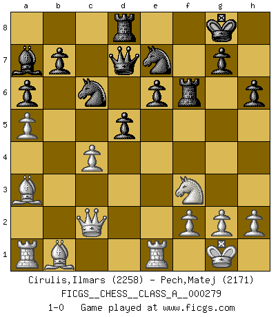 Last move : 1-0 2024 September 19 23:45:47 [Event "FICGS__CHESS__CLASS_A__000279"] [Site "FICGS"] [Date "2024.06.14"] [Round "1"] [White "Cirulis,Ilmars"] [Black "Pech,Matej"] [Result "1-0"] [WhiteElo "2258"] [BlackElo "2171"] 1.e4 e6 2.d4 d5 3.e5 c5 4.Nf3 cxd4 5.Bd3 Nc6 6.O-O Bc5 7.Nbd2 Nge7 8.Nb3 Bb6 9.a4 a6 10.a5 Ba7 11.Re1 Bd7 12.c3 dxc3 13.bxc3 h6 14.Ba3 O-O 15.Nc5 Qc7 16.Nxd7 Qxd7 17.Bb1 f5 18.exf6 Rxf6 19.c4 Rd8 20.Qc2 1-0 Follow this game move after move (download)You can only get good at Chess if you love the game. (Bobby Fischer) Man braucht nicht immer den besten Zug zu spielen: Ein Zug muß aktiv, unternehmungslustig, korrekt und schön sein. (David Bronstein) El Ajedrez demanda una total concentración. (Bobby Fischer) Le succès, c'est être capable d'aller d'échec en échec sans perdre son enthousiasme. (Winston Churchill) A woman without a man is like a fish without a bicycle. (Gloria Steinem)