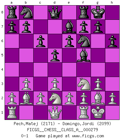 Last move : 0-1 2024 August 1 3:43:50 [Event "FICGS__CHESS__CLASS_A__000279"] [Site "FICGS"] [Date "2024.06.14"] [Round "1"] [White "Pech,Matej"] [Black "Domingo,Jordi"] [Result "0-1"] [WhiteElo "2171"] [BlackElo "2099"] 1.Nf3 d5 2.b3 Nf6 3.Bb2 Bf5 4.g3 e6 5.Bg2 h6 6.O-O c6 7.d3 Be7 8.Nbd2 O-O 0-1 This chess game has been lost on time (started : 2024.06.14 22:41:55) Follow this game move after move (download)Avoid the crowd. Do your own thinking independently. Be the Chess player, not the Chess piece. (Ralph Charell) Drei Punkte vor allen anderen ist wie einer, der im weißen Anzug posiert, während der Rest in Müllsäcke gekleidet dasteht. (Viktor Kortschnoi) Siempre es mucho mejor sacrificar las piezas de tu oponente. (Savielly Tartakover) C'est une question de caractère, Beaucoup de gens perdent leur motivation très vite. D'autres, ils sont rares, peuvent la conserver très longtemps. J'aime les échecs, encore aujourd'hui je suis heureux d'analyser des parties. J'aime toujours gagner, je déteste encore perdre. Bien jouer est important pour mon intégrité intellectuelle et morale. Et puis les échecs vivent en ce moment une période historique grâce à Internet. Ils se développent dans les systèmes éducatifs à travers le monde. Ils sortent de leur ghetto, et c'est mon rôle de mener à bien cette révolution. (Gary Kasparov) Perception is reality. (Immanuel Kant)