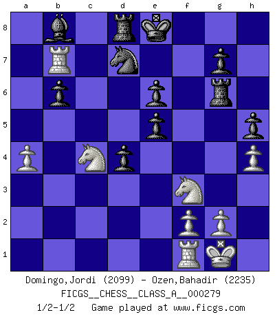 Last move : 1/2-1/2 2024 July 26 20:45:7 [Event "FICGS__CHESS__CLASS_A__000279"] [Site "FICGS"] [Date "2024.06.14"] [Round "1"] [White "Domingo,Jordi"] [Black "Ozen,Bahadir"] [Result "1/2-1/2"] [WhiteElo "2099"] [BlackElo "2235"] 1.e4 c6 2.d4 d5 3.e5 Bf5 4.h4 h5 5.Bd3 Bxd3 6.Qxd3 e6 7.Bg5 Qb6 8.Nd2 c5 9.c4 Qxb2 10.Rb1 Qxd4 11.Qxd4 cxd4 12.cxd5 f6 13.d6 b6 14.Ngf3 Nd7 15.Rc1 Nh6 16.Bxh6 Rxh6 17.O-O fxe5 18.Rc6 Rd8 19.a4 Nb8 20.Rc7 Bxd6 21.Rxa7 Nd7 22.Nc4 Bb8 23.Rb7 Rg6 1/2-1/2 Follow this game move after move (download)Every Chess master was once a beginner. (Chernev) Den Ruhm habe ich schon, jetzt brauche ich noch das Geld. (Wilhelm Steinitz) Hasta este punto, las blancas han seguido un análisis bien conocido. Pero ahora el hace un error fatal: empieza a usar su propia cabeza. (Siegbert Tarrasch) Votre seul travail dans les ouvertures est d'obtenir un milieu de partie jouable. (Lajos Portish) There is a computer disease that anybody who works with computers knows about. It's a very serious disease and it interferes completely with the work. The trouble with computers is that you 'play' with them ! (Richard P. Feynman)