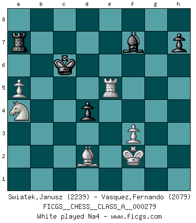 Last move : 1-0 2025 August 10 13:48:56 [Event "FICGS__CHESS__CLASS_A__000279"] [Site "FICGS"] [Date "2024.06.14"] [Round "1"] [White "Swiatek,Janusz"] [Black "Vasquez,Fernando"] [Result "1-0"] [WhiteElo "2239"] [BlackElo "2079"] 1.d4 Nf6 2.c4 g6 3.Nc3 Bg7 4.e4 d6 5.h3 O-O 6.Be3 e5 7.d5 a5 8.g4 Na6 9.Nge2 Nd7 10.Qd2 Ndc5 11.Ng3 a4 12.Be2 Bd7 13.h4 Qc8 14.g5 Bg4 15.f3 Bh3 16.O-O-O a3 17.b3 f6 18.gxf6 Rxf6 19.Rdg1 Bd7 20.h5 Qf8 21.hxg6 Rxg6 22.Nh5 Be8 23.Nxg7 Qxg7 24.Rxg6 Bxg6 25.Nb5 Nd7 26.Nxa3 Nf6 27.Nb5 Nh5 28.Kb2 Ng3 29.Rg1 Nxe2 30.Qxe2 Qe7 31.Qg2 Rf8 32.Bh6 Rf7 33.Nc3 Nb4 34.Qh3 Nd3+ 35.Kc2 Nb4+ 36.Kd2 Qd7 37.Qg3 Na6 38.a3 Nc5 39.Kc2 Kh8 40.Be3 Kg8 41.Bh6 Kh8 42.Rg2 Kg8 43.Rh2 Qe8 44.Qh3 Nd7 45.b4 Nf6 46.a4 Qd7 47.a5 Qxh3 48.Rxh3 Nd7 49.Kd2 Kh8 50.Na4 Kg8 51.Ke2 c6 52.dxc6 bxc6 53.Rg3 Nb8 54.c5 d5 55.exd5 cxd5 56.b5 Ra7 57.Bd2 Kf7 58.Rg5 Ke6 59.c6 Nxc6 60.bxc6 Kd6 61.Nb6 Kxc6 62.Rxe5 Bf7 63.Kf2 d4 64.Na4 h5 65.Rc5+ Kd6 66.Bf4+ Ke6 67.Re5+ Kf6 68.Nc5 Kg7 69.Rg5+ Kh7 70.a6 Ra8 71.Nd7 Bg6 72.Ra5 1-0 Follow this game move after move (download)I'm not a materialistic person, in that, I don't suffer the lack or loss of money. The absence of worldly goods I don't look back on. For Chess is a way I can be as materialistic as I want without having to sell my soul. (Jamie Walter Adams) Ein guter Spieler hat immer Glück. (José Raúl Capablanca) El Ajedrez es la vida. (Bobby Fischer) D'abord les bases : Jouez et étudiez, puis étudiez et jouez, ensuite jouez et étudiez, puis étudiez et jouez. Deuxièmement : Donnez toujours le meilleur de vous-même ! (Ken Smith) Internal peace cannot coexist with external war. (Don Groves)