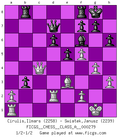 Last move : 1/2-1/2 2024 August 7 20:23:58 [Event "FICGS__CHESS__CLASS_A__000279"] [Site "FICGS"] [Date "2024.06.14"] [Round "1"] [White "Cirulis,Ilmars"] [Black "Swiatek,Janusz"] [Result "1/2-1/2"] [WhiteElo "2258"] [BlackElo "2239"] 1.e4 c5 2.d4 cxd4 3.c3 dxc3 4.Nxc3 Nc6 5.Nf3 e6 6.Be2 Nf6 7.O-O d6 8.Qb3 h6 9.Rd1 e5 10.Be3 Be7 11.Nh4 Rb8 12.Nf5 Bxf5 13.exf5 O-O 14.Rd2 Qd7 15.g4 b5 16.Nd5 Na5 17.Nxf6+ Bxf6 18.Qd5 Nc4 19.Bxc4 bxc4 20.Qxc4 a5 21.h3 a4 22.b4 axb3 1/2-1/2 Follow this game move after move (download)Chess books should be used as we use glasses: to assist the sight, although some players make use of them as if they thought they conferred sight. (Jose Raul Capablanca) Fischer machte Schach einfach zu einer aufregenden Sache, wann immer er sich ans Brett setzte. (Raymond Keene) Uno no tiene que jugar muy bien, es suficiente jugar mejor que el oponente. (Siegbert Tarrasch) Un journaliste : 'Vous préférez avoir une dame de plus sur l'échiquier ou au lit ?' Boris Spassky : 'Ca dépend de la position.' . 'gn is not allowed in chess unless n is an integer between 1 and 8 inclusive, where 1 and 8 are to interpreted as the standard numerals standing for integers in the ordered real-closed field R, with the *canonical* ordering. (As opposed to, say, an integer in the domain Z[2+i*sqrt(5)] or an integer in some exotic Grothendieck topos). (Normajean Yates)