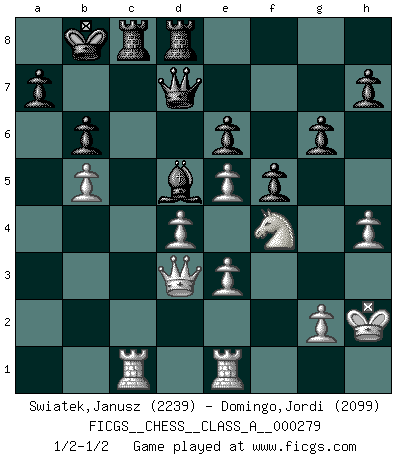 Last move : 1/2-1/2 2024 October 9 20:2:59 [Event "FICGS__CHESS__CLASS_A__000279"] [Site "FICGS"] [Date "2024.06.14"] [Round "1"] [White "Swiatek,Janusz"] [Black "Domingo,Jordi"] [Result "1/2-1/2"] [WhiteElo "2239"] [BlackElo "2099"] 1.d4 d5 2.c4 dxc4 3.e4 Nf6 4.e5 Nd5 5.Bxc4 Nb6 6.Bd3 Nc6 7.Be3 Nb4 8.Be4 f5 9.a3 N4d5 10.Bxd5 Nxd5 11.Ne2 Be6 12.Nbc3 Qd7 13.Rc1 c6 14.h4 Nxe3 15.fxe3 g6 16.Nf4 Bh6 17.Nce2 Bxf4 18.Nxf4 O-O-O 19.b4 Bd5 20.a4 Kb8 21.O-O Rc8 22.Qd3 e6 23.b5 cxb5 24.axb5 b6 25.Kh2 Rhd8 26.Kg3 Re8 27.Rg1 Red8 28.Rge1 Re8 29.Rh1 Ka8 30.Rhf1 Kb8 31.Kh2 Red8 32.Rfe1 Qe7 33.Kh3 Qd7 34.Kg3 Re8 35.Kh2 Red8 1/2-1/2 Follow this game move after move (download)One bad move nullifies forty good ones. (Horowitz) Kein Schachspieler kann gut schlafen. (H. G. Wells) El Ajedrez es en su esencia, un juego. En su forma, un arte. Y en su ejecución, una ciencia. (Baron Tassilo) Les échecs, c'est la lutte contre l'erreur. (Johannes Zukertort) The smarter you play, the luckier you'll be. (Mark Pilarski)