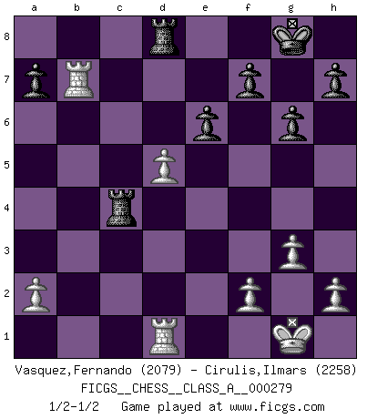 Last move : 1/2-1/2 2024 November 17 0:32:24 [Event "FICGS__CHESS__CLASS_A__000279"] [Site "FICGS"] [Date "2024.06.14"] [Round "1"] [White "Vasquez,Fernando"] [Black "Cirulis,Ilmars"] [Result "1/2-1/2"] [WhiteElo "2079"] [BlackElo "2258"] 1.e4 c5 2.c3 g6 3.d4 d5 4.exd5 Qxd5 5.Nf3 Bg7 6.Na3 cxd4 7.Bc4 Qe4+ 8.Be3 Nh6 9.cxd4 O-O 10.O-O Bg4 11.Bxh6 Bxh6 12.Re1 Bxf3 13.Rxe4 Bxd1 14.Rxd1 Bg5 15.Re5 Bf6 16.Rb5 Rc8 17.Rxb7 Nc6 18.d5 Na5 19.Rb4 Bxb2 20.Rxb2 Nxc4 21.Nxc4 Rxc4 22.Rb7 Rd8 23.g3 e6 1/2-1/2 Follow this game move after move (download)Via the squares on the chessboard, the Indians explain the movement of time and the age, the higher influences which control the world and the ties which link Chess with the human soul. (Al-Masudi) Ein Großmeister muß tausende Partien in seinem Kopf speichern, denn diese sind für Ihn, was die Worte der Muttersprache für gewöhnliche Leute sind, oder Noten für Musiker... (Garry Kasparov) Debes de llevar a tu oponente hacia un profundo y obscuro bosque donde 2+2=5, y el camino que conduce a la salida es suficientemente ancho para solamente uno. (Mikhail Tal) Les Echecs représentent une sphère d'idées créatrices basée sur la volonté des deux protagonistes. (Smyslov) There is a very easy way to return from a casino with a small fortune : go there with a large one. (Jack Yelton)