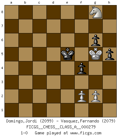 Last move : 1-0 2025 March 31 11:19:27 [Event "FICGS__CHESS__CLASS_A__000279"] [Site "FICGS"] [Date "2024.06.14"] [Round "1"] [White "Domingo,Jordi"] [Black "Vasquez,Fernando"] [Result "1-0"] [WhiteElo "2099"] [BlackElo "2079"] 1.e4 e5 2.Nf3 Nf6 3.Nxe5 d6 4.Nf3 Nxe4 5.d4 d5 6.Bd3 Nc6 7.O-O Be7 8.c4 Nb4 9.Be2 O-O 10.a3 Nc6 11.cxd5 Qxd5 12.Nc3 Nxc3 13.bxc3 Bf5 14.Bf4 Rac8 15.Re1 Rfe8 16.h3 h6 17.Nd2 Bd6 18.Be3 Na5 19.c4 Qe6 20.Qa4 b6 21.c5 Bf8 22.Bf3 Qg6 23.Rac1 Bxh3 24.d5 Re5 25.Red1 Re7 26.Qh4 Bd7 27.c6 Bf5 28.Bf4 Bc2 29.Re1 Rce8 30.Rxe7 Bxe7 31.Qg4 Bxa3 32.Qd7 Ra8 33.Re1 Bd6 34.Bxd6 Qxd6 35.Qxd6 cxd6 36.Bg4 f5 37.Bh5 Ba4 38.Be8 Kf8 39.Bd7 Bb5 40.Re6 Nc4 41.Nf3 Ba6 42.Nd4 b5 43.Re1 Kf7 44.Ra1 Bc8 45.Bxc8 Rxc8 46.Nxb5 Ra8 47.Rxa7+ Rxa7 48.Nxa7 f4 49.c7 Nb6 50.c8Q Nxc8 51.Nxc8 Kf6 52.Nxd6 Ke5 53.Ne8 g6 54.d6 Ke6 55.Kh2 Kd7 56.Nf6+ Kxd6 57.Kh3 Ke6 58.Ng8 h5 59.Kh4 Ke5 60.Kg5 1-0 Follow this game move after move (download)Discovered check is the dive bomber of the Chessboard. (Reuben Fine) Obwohl ich alt bin, darf mir niemand den Finger in den Mund stecken, sonst beisse ich. (Wilhelm Steinitz) Todavía soy una víctima del Ajedrez. Tiene toda la belleza del arte y mucho mas. No puede ser comercializado. El Ajedrez es mas puro que el arte en su posición social. (Marcel Duchamp) Les Cavaliers se révèlent fort utiles dans les positions fermées. D'habitude, les Fous sont un peu plus forts que les Cavaliers dans les positions ouvertes. Qu'on le veuille ou non, il restera toujours des exceptions ! I feel so... helpless. (C-3PO in Star Wars ep.3)