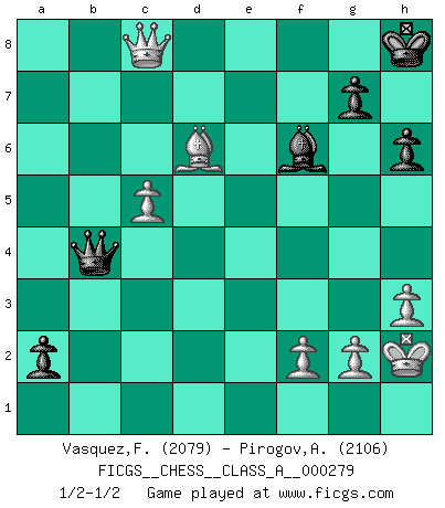 Last move : 1/2-1/2 2025 April 23 4:22:5 [Event "FICGS__CHESS__CLASS_A__000279"] [Site "FICGS"] [Date "2024.06.14"] [Round "1"] [White "Vasquez,Fernando"] [Black "Pirogov,Andrey Mikhaylovich"] [Result "1/2-1/2"] [WhiteElo "2079"] [BlackElo "2106"] 1.e4 c5 2.c3 d5 3.exd5 Qxd5 4.d4 Nc6 5.Nf3 Nf6 6.Be2 cxd4 7.cxd4 e6 8.O-O Be7 9.Nc3 Qd6 10.Nb5 Qd8 11.Bf4 Nd5 12.Bg3 O-O 13.Rc1 Bd7 14.Nc3 Rc8 15.Re1 Bb4 16.a3 Nxc3 17.bxc3 Bxa3 18.Rb1 Na5 19.c4 Be7 20.Ne5 Be8 21.c5 Bc6 22.Bd3 Bd5 23.h3 Nc6 24.Qh5 f5 25.Nxc6 bxc6 26.Qd1 Qe8 27.Rb7 a5 28.Qc2 Rd8 29.Bc4 f4 30.Bxd5 Rxd5 31.Rxe6 Rd7 32.Qc4 Kh8 33.Rxd7 Qxd7 34.Bh2 a4 35.Re4 Qb7 36.Qe6 Bf6 37.Bxf4 h6 38.Bd6 Ra8 39.d5 a3 40.dxc6 Qb1+ 41.Kh2 a2 42.c7 Qb7 43.Rb4 Qxb4 44.c8Q+ Rxc8 45.Qxc8+ Kh7 46.Qf5+ Kh8 47.Qc8+ Kh7 48.Qf5+ Kh8 49.Qc8+ 1/2-1/2 Follow this game move after move (download)In order to improve your game, you must study the endgame before everything else, for whereas the endings can be studied and mastered by themselves, the middle game and the opening must be studied in relation to the endgame. (Jose Raul Capablanca) Wenn es im Universum noch irgendwo intelligente Lebewesen gibt, dann kennen sie Go. (Emanuel Lasker) El Rey es una pieza de pelea. ¡Usenlo!. (Wilhelm Steinitz) Il (Jacob Murray) ne joue pas pour le bon coup, mais pour le meilleur. (Eloi Relange) No, I am still playing. (Anatoly Karpov)