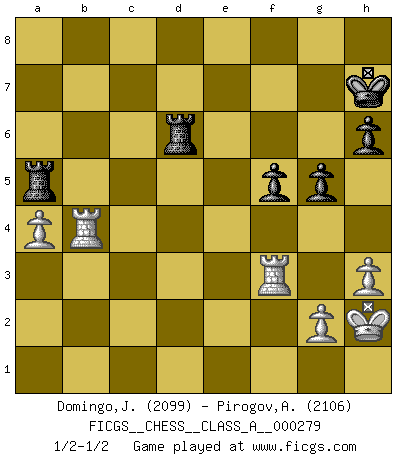 Last move : 1/2-1/2 2024 September 20 16:32:33 [Event "FICGS__CHESS__CLASS_A__000279"] [Site "FICGS"] [Date "2024.06.14"] [Round "1"] [White "Domingo,Jordi"] [Black "Pirogov,Andrey Mikhaylovich"] [Result "1/2-1/2"] [WhiteElo "2099"] [BlackElo "2106"] 1.e4 c5 2.Nf3 Nc6 3.d4 cxd4 4.Nxd4 Nf6 5.Nc3 e5 6.Ndb5 d6 7.Nd5 Nxd5 8.exd5 Nb8 9.a4 Be7 10.Be2 O-O 11.O-O f5 12.f4 a6 13.Na3 Nd7 14.Kh1 exf4 15.Bxf4 Nc5 16.Nc4 a5 17.Ra3 b6 18.Rg3 Nxa4 19.Nxd6 Bxd6 20.Qd4 Ra7 21.Qxa4 Re7 22.Bd3 Bb7 23.Bxd6 Qxd6 24.Qd4 Qe5 25.Qxe5 Rxe5 26.c4 b5 27.b3 a4 28.bxa4 bxc4 29.Bxc4 Bxd5 30.Bxd5+ Rxd5 31.h3 Ra8 32.Ra3 R8a5 33.Rf4 h6 34.Kh2 Kh7 35.Raf3 g5 36.Rb4 Rd6 1/2-1/2 Follow this game move after move (download)After black's reply to 1.e4 with 1..e5, leaves him always trying to get into the game. (Howard Staunton) Gott hat gewollt, dass ich Champion werde. (Surab Azmajparaschvili) Los Peones son nacidos libres, y aún así, se encuentran encadenados por todos lados. (Rick Kennedy) Nous sommes les pions de la mystérieuse partie d'Echecs jouée par Dieu. Il nous déplace, nous arrête, nous pousse encore, puis nous lance un à un dans la boîte du Néant. Epitaphe sur la tombe de David Janowsky (1868-1927). Computers make it easier to do a lot of things, but most of the things they make it easier to do don't need to be done. (Andy Rooney)