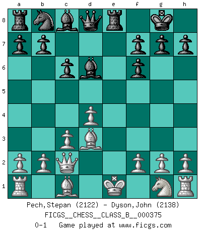 Last move : 0-1 2024 July 28 16:52:20 [Event "FICGS__CHESS__CLASS_B__000375"] [Site "FICGS"] [Date "2024.06.14"] [Round "1"] [White "Pech,Stepan"] [Black "Dyson,John"] [Result "0-1"] [WhiteElo "2122"] [BlackElo "2138"] 1.e4 c6 2.d4 d5 3.Nc3 dxe4 4.Nxe4 Nf6 5.Nxf6+ exf6 6.c3 Bd6 7.Bd3 O-O 8.Qc2 Re8+ 0-1 This chess game has been lost on time (started : 2024.06.14 22:43:20) Follow this game move after move (download)The laws of Chess do not permit a free choice: you have to move whether you like it or not. (Emanuel Lasker) Schach sollte überall auf der Welt Schulfach werden. Es fördert die geistige Auseinandersetzung. Es lehrt die Demut in der Niederlage. (Garry Kasparov) No puedes jugar al Ajedrez si eres de corazón noble. (Proverbio Francés) Je ne suis pas le dernier à jouer lâchement des coups douteux pendant le zeïtnot de l'adversaire pour l'achever: en effet les coups qui font le plus peur sont ceux que l'on ne comprend pas. Je me fais souvent peur quand je joue. (Un professeur anonyme) Live, lose, and learn, by observing your opponent how to win. (Amber Steenbock)