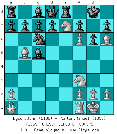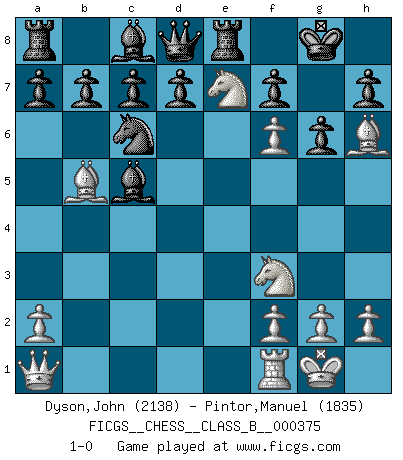Last move : 1-0 2024 June 27 17:24:43 [Event "FICGS__CHESS__CLASS_B__000375"] [Site "FICGS"] [Date "2024.06.14"] [Round "1"] [White "Dyson,John"] [Black "Pintor,Manuel"] [Result "1-0"] [WhiteElo "2138"] [BlackElo "1835"] 1.e4 e5 2.Nf3 Nc6 3.Bb5 Qf6 4.Nc3 Bc5 5.Nd5 Qd8 6.c3 Nf6 7.O-O O-O 8.d4 exd4 9.Bg5 dxc3 10.e5 cxb2 11.exf6 bxa1Q 12.Qxa1 g6 13.Bh6 Re8 14.Ne7+ 1-0 Follow this game move after move (download)The hardest game to win is a won game. (Emanuel Lasker) In Buenos Aires ist es nicht mein vorrangiges Ziel ein starkes Turnier zu organisieren, sondern ein Turnier für Gentlemen. Ich würde nie Kamsky einladen. Ich mag keine Probleme. (Miguel Najdorf) Cada Peón es potencialmente una Reina. (James Mason) Les échecs sont un jeu terrible. Si vous n'avez pas le centre, votre adversaire a une position plus libre. Par contre, si vous avez le centre, alors vous avez vraiment quelque chose pour laquelle vous inquiéter ! (Siegbert Tarrasch) Without enthusiasm, virtue functions not at all, and vice only poorly. (Mignon McLaughlin, The Neurotic's Notebook, 1960)