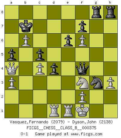 Last move : 0-1 2025 April 3 7:38:24 [Event "FICGS__CHESS__CLASS_B__000375"] [Site "FICGS"] [Date "2024.06.14"] [Round "1"] [White "Vasquez,Fernando"] [Black "Dyson,John"] [Result "0-1"] [WhiteElo "2079"] [BlackElo "2138"] 1.e4 c6 2.d4 d5 3.e5 c5 4.dxc5 e6 5.a3 Bxc5 6.b4 Be7 7.Qg4 g6 8.Nf3 a5 9.b5 Nd7 10.Bd3 h5 11.Qf4 Nh6 12.O-O b6 13.Nc3 Nf5 14.Ne2 Nc5 15.Be3 Bb7 16.Bxc5 bxc5 17.Rad1 g5 18.Qc1 h4 19.c4 d4 20.h3 Rg8 21.Rfe1 g4 22.hxg4 Rxg4 23.Kf1 Qd7 24.Nf4 O-O-O 25.Nh2 Rg7 26.Qc2 Bg5 27.Nd5 Kb8 28.Be4 Rh8 29.Nf6 Bxf6 30.exf6 R7g8 31.Nf3 h3 32.gxh3 Qc7 33.b6 Qf4 34.Bxb7 Kxb7 35.Qa4 Ng3+ 0-1 This chess game has been lost on time (started : 2024.06.14 22:43:20) Follow this game move after move (download)For me, Chess is life and every game is like a new life. Every Chess player gets to live many lives in one lifetime. (Eduard Gufeld) Das Schachspiel ist ein See, in welchem eine Mücke baden und ein Elefant ertrinken kann. (Emanuel Lasker) Fischer era un maestro de claridad y un Rey del posicionamiento astuto. Sus oponentes podían ver hacia donde se dirigía pero eran impotentes para detenerlo. (Bruce Pandolfini) Horreur, mais aussi harmonie suprême : qu'y avait-il en effet au monde en dehors des échecs ? Le brouillard, l'inconnu, le non-être... (Vladimir Nabokov) You can't play chess if you're groggy from pills. (Anatoly Karpov)