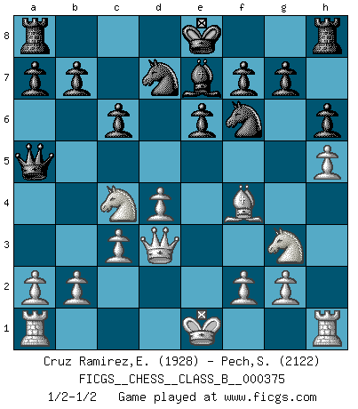 Last move : 1/2-1/2 2024 August 13 18:56:36 [Event "FICGS__CHESS__CLASS_B__000375"] [Site "FICGS"] [Date "2024.06.14"] [Round "1"] [White "Cruz Ramirez,Eliecer"] [Black "Pech,Stepan"] [Result "1/2-1/2"] [WhiteElo "1928"] [BlackElo "2122"] 1.e4 c6 2.d4 d5 3.Nc3 dxe4 4.Nxe4 Bf5 5.Ng3 Bg6 6.Nf3 Nd7 7.h4 h6 8.h5 Bh7 9.Bd3 Bxd3 10.Qxd3 e6 11.Bf4 Qa5+ 12.c3 Ngf6 13.Ne5 Be7 14.Nc4 1/2-1/2 Follow this game move after move (download)I am the best player in the world and I am here to prove it. (Bobby Fischer) Obendrein hat der FIDE-Präsident den Revolutionsführer Gaddafi zum »Großmeister« ernannt, am Ende der WM. Das ist lächerlich! (Joel Lautier) La belleza de un movimiento no se refleja solo en su apariencia, sino en el pensamiento detrás de él. (Siegbert Tarrasch) On est toujours la mazette de quelqu'un d'autre. (Anonyme) Wipe them out. All of them. (Darth Sidious in Star Wars ep.1)