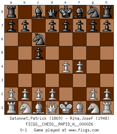 Last move : 0-1 2007 October 21 19:42:18 [Event "FICGS__CHESS__RAPID_A__000026"] [Site "FICGS"] [Date "2007.09.19"] [Round "1"] [White "Satonnet,Patrick"] [Black "Riha,Josef"] [Result "0-1"] [WhiteElo "1869"] [BlackElo "1948"] 1.e4 c5 2.f4 Nc6 0-1 This chess game has been lost on time (started : 2007.09.19 12:30:22) Sicilian : Grand Prix attack Player Black won this chess game. Follow this game move after move (download)A Chess game is divided into three stages: the first, when you hope you have the advantage, the second when you believe you have an advantage, and the third... when you know you're going to lose ! (Savielly Tartakower) Ich kenne Menschen, die allen Willen der Welt besitzen und doch nicht Schach spielen können. (Robert James Fischer) ¿Esta Bobby Fischer algo cuerdo?. (Salo Flohr) Karpov est une pièce de musée. (Garry Kasparov) When the going gets tactical, the computers get going. (Hyatt)