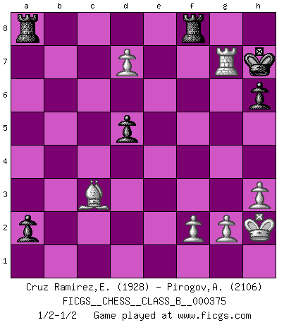 Last move : 1/2-1/2 2024 September 12 18:26:44 [Event "FICGS__CHESS__CLASS_B__000375"] [Site "FICGS"] [Date "2024.06.14"] [Round "1"] [White "Cruz Ramirez,Eliecer"] [Black "Pirogov,Andrey Mikhaylovich"] [Result "1/2-1/2"] [WhiteElo "1928"] [BlackElo "2106"] 1.e4 c5 2.c3 d5 3.exd5 Qxd5 4.Nf3 Nc6 5.d4 Nf6 6.Be2 cxd4 7.cxd4 e6 8.Nc3 Qd6 9.O-O Be7 10.Nb5 Qd8 11.Bf4 Nd5 12.Bg3 O-O 13.Rc1 Qa5 14.Ne5 Nxe5 15.dxe5 Bd7 16.Nd6 Qxa2 17.Bc4 Qxb2 18.Bxd5 exd5 19.Rb1 Qc3 20.Rxb7 Rfd8 21.Qh5 Bxd6 22.exd6 Qd3 23.h3 Qf5 24.Qd1 a5 25.Re1 a4 26.Re5 Qf6 27.Re7 Qf5 28.Be5 a3 29.Bc3 Be6 30.Qd4 Qf6 31.Qe3 Qg6 32.d7 h6 33.Rb6 a2 34.Kh2 Qg5 35.Rbxe6 fxe6 36.Qxe6+ Kh7 37.Qf7 Rf8 38.Qxg7+ Qxg7 39.Rxg7+ Kh8 40.Rg6 Kh7 41.Rg7+ 1/2-1/2 Follow this game move after move (download)The most important feature of the Chess position is the activity of the pieces. This is absolutely fundamental in all phases of the game: Opening, Middlegame and especially Endgame. The primary constraint on a piece's activity is the Pawn structure. (Michael Stean) Ein Remis kann durch Wiederholung von drei Zügen oder durch einen schlechte Zug erreicht werden. (Savielly Grigorievitsch Tartakower) Yo tuve un dolor de muelas en la primer partida. En el segundo juego, tuve un dolor de cabeza. En el tercero, tuve un ataque de reumatísmo. En la cuarta partida, no me sentía muy bien. ¿Y en el quinto juego? Bueno, ¿que acaso uno tiene que ganar todos los juegos?. (Siegbert Tarrasch) D'abord les bases : Jouez et étudiez, puis étudiez et jouez, ensuite jouez et étudiez, puis étudiez et jouez. Deuxièmement : Donnez toujours le meilleur de vous-même ! (Ken Smith) Optimism is a variety of information deficit. Sometimes especially true for correspondence chess games. (Michael Aigner)