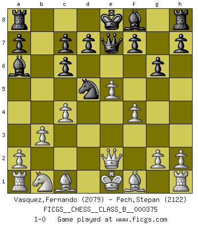 Last move : 1-0 2024 July 31 16:44:0 [Event "FICGS__CHESS__CLASS_B__000375"] [Site "FICGS"] [Date "2024.06.14"] [Round "1"] [White "Vasquez,Fernando"] [Black "Pech,Stepan"] [Result "1-0"] [WhiteElo "2079"] [BlackElo "2122"] 1.e4 e5 2.Nf3 Nc6 3.d4 exd4 4.Nxd4 Nf6 5.Nxc6 bxc6 6.e5 Qe7 7.Qe2 Nd5 8.c4 Ba6 9.b3 g6 10.f4 1-0 This chess game has been lost on time (started : 2024.06.14 22:43:20) Follow this game move after move (download)Spassky will not be psyched out by Fischer. (Mike Goodall) Heutzutage gewinnt im Turnier nicht derjenige Spieler, der weitreichende Pläne entwirft, sondern einfach jener, der Zug um Zug kämpft. (David Bronstein) Fischer no está bajo la obligación de nadie. (Joseph Platz) Les échecs, c'est la lutte contre l'erreur. (Johannes Zukertort) I believe in luck. How else can you explain the success of those you dislike ? (Jean Cocteau)