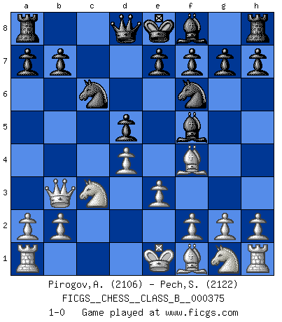 Last move : 1-0 2024 July 30 12:31:50 [Event "FICGS__CHESS__CLASS_B__000375"] [Site "FICGS"] [Date "2024.06.14"] [Round "1"] [White "Pirogov,Andrey Mikhaylovich"] [Black "Pech,Stepan"] [Result "1-0"] [WhiteElo "2106"] [BlackElo "2122"] 1.d4 d5 2.c4 c6 3.cxd5 cxd5 4.Bf4 Nc6 5.e3 Nf6 6.Nc3 Bf5 7.Qb3 1-0 This chess game has been lost on time (started : 2024.06.14 22:43:20) Follow this game move after move (download)Modern Chess is too much concerned with things like Pawn structure. Forget it, Checkmate ends the game. (Nigel Short) Ein Kibitz ist einer, der deinem Gegner gute Ratschläge gibt. (Andrew Soltis) Aquellos que dicen que entienden al Ajedrez, no entienden nada. (Robert Hubner) Ce qui caractérise les parties de combat, c'est que si le défenseur a constamment de difficiles problèmes à résoudre, l'attaquant doit chercher sans relâche de nouvelles possibilités d'attaque. (Koblentz) There is no vagueness without wind. (Chinese proverb)