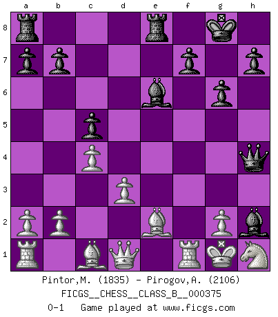 Last move : 0-1 2024 July 4 20:49:24 [Event "FICGS__CHESS__CLASS_B__000375"] [Site "FICGS"] [Date "2024.06.14"] [Round "1"] [White "Pintor,Manuel"] [Black "Pirogov,Andrey Mikhaylovich"] [Result "0-1"] [WhiteElo "1835"] [BlackElo "2106"] 1.e4 c5 2.f4 d5 3.exd5 Nf6 4.c4 e6 5.dxe6 Bxe6 6.Nf3 Nc6 7.d3 g6 8.Nc3 Bg7 9.Be2 O-O 10.O-O Re8 11.Ne5 Nxe5 12.fxe5 Ng4 13.Ne4 Qd4+ 14.Nf2 Nxh2 15.Kxh2 Bxe5+ 16.Kg1 Qh4 17.Nh1 Bh2+ 0-1 Follow this game move after move (download)Becoming successful at Chess allows you to discover your own personality. That's what I want for the kids I teach. (Saudin Robovic) Intelligenz läßt sich nicht am Weg, sondern nur am Ergebnis feststellen. (Garry Kasparov) El tablero es el mundo, las piezas es el fenomeno del universo, las reglas del juego son lo que llamamos leyes de la naturaleza y el jugador del lado opuesto, se encuentra oculto a nuestra vista. (Thomas Huxley) Un millionnaire : 'Monsieur Steinitz ! Vous ne participez aux tournois que pour l'argent, alors que moi je n'y viens que pour l'honneur.' Steinitz : 'Chacun joue pour ce qu'il n'a pas'... It is a good thing for an uneducated man to read books of quotations. (Winston Churchill)