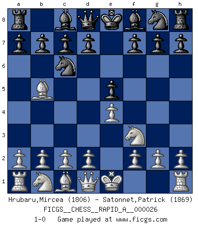 Last move : 1-0 2007 October 24 2:0:16 [Event "FICGS__CHESS__RAPID_A__000026"] [Site "FICGS"] [Date "2007.09.19"] [Round "1"] [White "Hrubaru,Mircea"] [Black "Satonnet,Patrick"] [Result "1-0"] [WhiteElo "1806"] [BlackElo "1869"] 1.e4 e5 2.Nf3 Nc6 3.Bb5 1-0 This chess game has been lost on time (started : 2007.09.19 12:30:22) Ruy Lopez (Spanish Opening) Player White won this chess game. Follow this game move after move (download)A good player is always lucky. (Jose Raul Capablanca) Über Kasparov: Es ist offensichtlich, daß er in einem totalitären Staat aufwuchs und deshalb zu diktatorischen Zügen neigt. (Viktor Kortschnoi) El Ajedrez no es como la vida... ¡tiene reglas!. (Mark Pasternak) Assurément je connaissais par expérience le mystérieux attrait de ce jeu royal, le seul entre tous les jeux inventés par les hommes qui échappe souverainement à la tyrannie du hasard, le seul où l'on ne doive sa victoire qu'à son intelligence ou plutôt à une certaine forme d'intelligence. Mais n'est-ce pas déjà le limiter injurieusement que d'appeler les échecs un jeu ? N'est-ce pas une science, un art ou quelque chose qui, comme le cercueil de Mahomet entre ciel et terre, est suspendu entre l'un et l'autre, et qui réunit un nombre incroyable de contraires ? [...] C'est une pensée qui ne mène à rien, une mathématique qui n'établit rien, un art qui ne laisse pas d'uvre, une architecture sans matière; et il l'a prouvé néanmoins qu'il était plus durable, à sa manière, que les livres ou que tout autre monument, ce jeu unique qui appartient à tous les peuples et à tous les temps, et dont personne ne sait quel dieu en fit don à la terre pour tuer l'ennui, pour aiguiser l'esprit et stimuler l'âme. Où commence-t-il, où finit-il ? (Stefan Zweig) Ah, the Socrating method. The best way we have of teaching everything-apart from juggling chainsaws. (Gregory House, House M.D.)