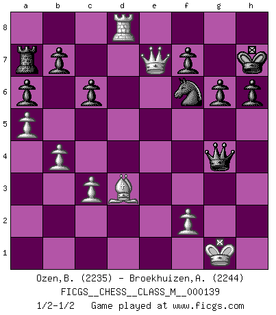 Last move : 1/2-1/2 2024 November 8 12:33:28 [Event "FICGS__CHESS__CLASS_M__000139"] [Site "FICGS"] [Date "2024.06.15"] [Round "1"] [White "Ozen,Bahadir"] [Black "Broekhuizen,A. T. S."] [Result "1/2-1/2"] [WhiteElo "2235"] [BlackElo "2244"] 1.e4 e5 2.Nf3 Nc6 3.Bc4 Bc5 4.c3 Nf6 5.d3 d6 6.O-O a6 7.a4 Ba7 8.b4 Ne7 9.Nbd2 O-O 10.Re1 h6 11.h3 Ng6 12.d4 Re8 13.Bd3 c6 14.a5 d5 15.dxe5 Nxe5 16.Nxe5 Rxe5 17.Nf3 Re8 18.exd5 Rxe1+ 19.Qxe1 Qxd5 20.Be3 Bxh3 21.Rd1 Qh5 22.gxh3 Qxf3 23.Bxa7 Rxa7 24.Be2 Qxh3 25.Rd8+ Kh7 26.Bd3+ g6 27.Qe7 Qg4+ 1/2-1/2 Follow this game move after move (download)Combinations have always been the most intriguing aspect of Chess. The masters look for them, the public applauds them, the critics praise them. It is because combinations are possible that Chess is more than a lifeless mathematical exercise. They are the poetry of the game; they are to Chess what melody is to music. They represent the triumph of mind over matter. (Reuben Fine) Sie führen leise Selbstgespräche, schlürfen lautstark ihre Getränke, schmatzen hörbar beim Essen, blasen ihrem Gegenüber Rauch in die Augen, niesen ihm ins Gesicht, starren ihn unverwandt an, bis er sich unter ihren Blicken windet, rutschen ständig auf ihrem Stuhl hin und her, rülpsen und bohren in der Nase. (Anonymous) Tu no necesitas jugar muy bien, únicamente ayudar a tu oponenet a que juegue muy mal. (Genrikh Chepukaitis) Soyez une menace à chaque fois que vous vous asseyez pour jouer. (Ken Smith) They say in chess you've got to kill the queen, and then you mate it... Oh I, do you ? (Red Hot Chili Peppers, Fortune faded)