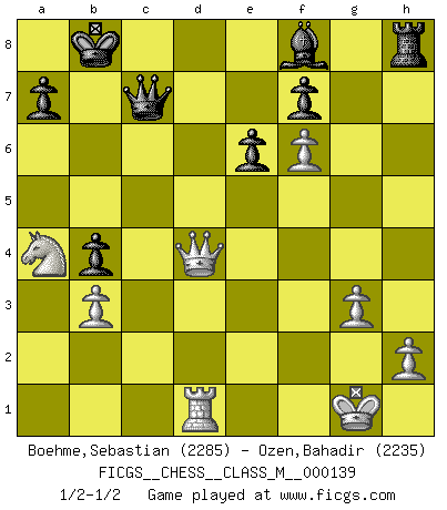 Last move : 1/2-1/2 2024 August 21 23:43:26 [Event "FICGS__CHESS__CLASS_M__000139"] [Site "FICGS"] [Date "2024.06.15"] [Round "1"] [White "Boehme,Sebastian"] [Black "Ozen,Bahadir"] [Result "1/2-1/2"] [WhiteElo "2285"] [BlackElo "2235"] 1.d4 Nf6 2.c4 e6 3.Nf3 d5 4.Nc3 c6 5.Bg5 dxc4 6.e4 b5 7.e5 h6 8.Bh4 g5 9.Nxg5 hxg5 10.Bxg5 Nbd7 11.g3 Bb7 12.Bg2 Qb6 13.exf6 O-O-O 14.O-O c5 15.d5 b4 16.Na4 Qb5 17.a3 Nb8 18.axb4 cxb4 19.Qg4 Bxd5 20.Rfc1 Nc6 21.Bxd5 Rxd5 22.Rxc4 Rxg5 23.Qd4 Kb8 24.Rxc6 Rxg3+ 25.fxg3 Qxc6 26.Rd1 Qc7 27.b3 Kc8 28.Qe4 Kb8 29.Qd4 Kc8 30.Qe3 Kb8 31.Qd4 1/2-1/2 Follow this game move after move (download)Fischer prefers to enter Chess history alone. (Miguel Najdorf) Sicherlich können nur Meister einen Stil haben. Daß ein nicht-Meister auch nur ein einziges Mal in seinem Leben eine Partie folgerecht durchführte, habe ich niemals bemerkt. (Emanuel Lasker) Un entendimiento minucioso de las típicas continuaciones de mate hacen de las mas complicadas combinaciones de sacrificio que conducen hacia ellas no solo no dificiles, sino casi un asunto de rutina. (Siegbert Tarrasch) Aidez vos pièces, elles vous aideront. (Paul Morphy) Luck never made a man wise. (Seneca, Letters to Lucilius)