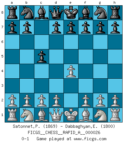 Last move : 0-1 2007 October 25 14:8:18 [Event "FICGS__CHESS__RAPID_A__000026"] [Site "FICGS"] [Date "2007.09.19"] [Round "1"] [White "Satonnet,Patrick"] [Black "Dabbaghyan,Edwin"] [Result "0-1"] [WhiteElo "1869"] [BlackElo "1800"] 1.e4 c5 0-1 This chess game has been lost on time (started : 2007.09.19 12:30:22) Sicilian defense Player Black won this chess game. Follow this game move after move (download)Modern Chess is too much concerned with things like Pawn structure. Forget it, Checkmate ends the game. (Nigel Short) Schachspieler können ausgezeichnet Varianten am Schachbrett berechnen, aber nicht im realen Leben. Zu stark ist der Individualismus im Schach ausgeprägt, und für viele ist ein kleiner momentaner persönlicher Vorteil wichtiger als ein weit größerer Vorteil von morgen. (Anatoly Karpov) El Ajedrez era la lengua materna de Capablanca. (Reti) Les Echecs représentent une sphère d'idées créatrices basée sur la volonté des deux protagonistes. (Smyslov) Hold em is to stud what chess is to checkers. (Johnny Moss)