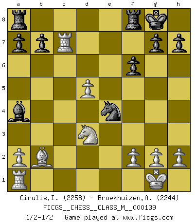 Last move : 1/2-1/2 2024 July 14 20:19:4 [Event "FICGS__CHESS__CLASS_M__000139"] [Site "FICGS"] [Date "2024.06.15"] [Round "1"] [White "Cirulis,Ilmars"] [Black "Broekhuizen,A. T. S."] [Result "1/2-1/2"] [WhiteElo "2258"] [BlackElo "2244"] 1.e4 e5 2.d4 exd4 3.Nf3 Bb4+ 4.c3 dxc3 5.Nxc3 Nf6 6.e5 Ne4 7.Qd4 Bxc3+ 8.bxc3 d5 9.Bb5+ Nc6 10.Ba3 Bd7 11.Qe3 Nxe5 12.Nxe5 Bxb5 13.c4 Ba4 14.O-O Qf6 15.Bb2 O-O 16.cxd5 Nd6 17.Rfc1 Qe7 18.Qf4 f6 19.Nd3 Qe4 20.Qxe4 Nxe4 21.Rxc7 1/2-1/2 Follow this game move after move (download)I love all positions. Give me a difficult positional game, I will play it. But totally won positions, I cannot stand them. (Hein Donner) Sehr viele beherrschen heutzutage das große Einmalseins des Schachspiels und kennen sogar dessen Logarithmentafeln auswendig - deshalb sollte man hin und wieder zu beweisen trachten, dass zwei mal zwei auch fünf sein kann. (Mikhail Nekhemyevich Tal) Ser exitoso en el Ajedrez te permite descubrir tu propia personalidad. Eso es lo que deseo para los niños de mi clase. (Saudin Robovic) Les échecs c'est le défi de l'alpiniste, toujours plus haut, prêt à tout pour monter à l'assaut du Roi ennemi. Les échecs, c'est de la musique en mouvement, un ballet majestueux pour les yeux. C'est de la poésie composée par les fantômes du passé qui au même titre que Rimbaud ou Verlaine méritent notre admiration. Les échecs, c'est de la peinture ou le moindre mouvement modifie le tableau pour en faire un Picasso ou un Van Gogh. Les échecs, c'est tout et rien, c'est la vie et la mort. Jjulie33 sur le forum de France-Echecs. Computer Science is no more about computers than astronomy is about telescopes. (Edsger W. Dijkstra)