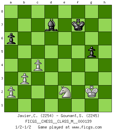 Last move : 1/2-1/2 2024 September 11 14:39:29 [Event "FICGS__CHESS__CLASS_M__000139"] [Site "FICGS"] [Date "2024.06.15"] [Round "1"] [White "Javier,Christian"] [Black "Gounant,Stanislas"] [Result "1/2-1/2"] [WhiteElo "2254"] [BlackElo "2245"] 1.d4 e6 2.e4 d5 3.Nc3 dxe4 4.Nxe4 Nd7 5.Nf3 Ngf6 6.Nxf6+ Nxf6 7.c3 c5 8.Ne5 a6 9.Be3 Qc7 10.Qa4+ Nd7 11.Bb5 cxd4 12.Bxd7+ Bxd7 13.Qxd4 Bc8 14.Nc4 Bd7 15.Ne5 Bc8 16.Qe4 Be7 17.O-O-O O-O 18.Bf4 Bd6 19.Rd3 f6 20.Ng6 Bxf4+ 21.Nxf4 Qf7 22.Rd6 e5 23.Nd5 Rb8 24.Rd1 Be6 25.Qf3 h6 26.b3 Rbc8 27.Kb2 Rc6 28.Rxc6 bxc6 29.Nb6 Qc7 30.Na4 f5 31.Qd3 Bd5 32.g3 f4 33.c4 Bg2 34.Nc5 Qe7 35.Qd6 Qxd6 36.Rxd6 fxg3 37.fxg3 Rf2+ 38.Ka3 Bf3 39.Nd3 Re2 40.Nb4 Rxh2 41.Nxc6 e4 42.Ne5 Bh1 43.Rd1 Rh5 44.Nc6 e3 45.Nd4 Bg2 46.Rg1 Bh3 47.Kb4 Rg5 48.Kc3 h5 49.Kd3 h4 50.Kxe3 Rxg3+ 51.Rxg3 hxg3 52.Kf3 g2 53.Ne2 g5 54.Kg3 Bd7 55.Kxg2 Kf7 1/2-1/2 Follow this game move after move (download)There's never before been a Chess player with such a thorough knowledge of the intricacies of the game and such an absolutely indomitable will to win. I think Bobby is the greatest player that ever lived. (Lisa Lane) Die Neutralität betrachte ich als eine schwere Krankheit. (Viktor Kortschnoi) Tu no necesitas jugar muy bien, únicamente ayudar a tu oponenet a que juegue muy mal. (Genrikh Chepukaitis) Je ne crois pas en la psychologie, je crois aux bons coups. (Robert Fischer) Never risk one's whole fortune unless supported by one's entire army. (Niccolo Machiavelli)