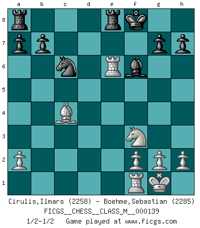 Last move : 1/2-1/2 2024 July 23 20:25:59 [Event "FICGS__CHESS__CLASS_M__000139"] [Site "FICGS"] [Date "2024.06.15"] [Round "1"] [White "Cirulis,Ilmars"] [Black "Boehme,Sebastian"] [Result "1/2-1/2"] [WhiteElo "2258"] [BlackElo "2285"] 1.e4 c5 2.d4 cxd4 3.c3 dxc3 4.Nxc3 Nc6 5.Nf3 e6 6.Be2 Nf6 7.O-O d5 8.exd5 exd5 9.Bg5 Be7 10.Bxf6 Bxf6 11.Nxd5 O-O 12.Qb3 Bxb2 13.Rad1 Bf6 14.Qe3 Be6 15.Nf4 Qc8 16.Nxe6 Qxe6 17.Qxe6 fxe6 18.Bc4 Rfe8 19.Rd6 Kf8 20.Rxe6 1/2-1/2 Follow this game move after move (download)The defensive power of a pinned piece is only imaginary. (Aaron Nimzovich) Ich bewundere Kasparows phantasievolle Angriffssiege aus den Achtzigern und Neunzigern, aber wenn man sie mit dem Computer überprüft, nimmt der Computer in jeder zweiten Partie die Opfer an, verteidigt sich und gewinnt. (Vladimir Kramnik) El muchacho (en ese entonces un niño de 12 años llamado Anatoly Karpov) no tiene ni idea de lo que es el Ajedrez y no hay futuro en absoluto para el en esta profesión. (Mikhail Botvinnik) Je ne suis pas le dernier à jouer lâchement des coups douteux pendant le zeïtnot de l'adversaire pour l'achever: en effet les coups qui font le plus peur sont ceux que l'on ne comprend pas. Je me fais souvent peur quand je joue. (Un professeur anonyme) Vladimir Ras-Putin is still alive... He is also a good actor, I saw him in the Lord of the Rings. (Rodolfo d'Ettorre)
