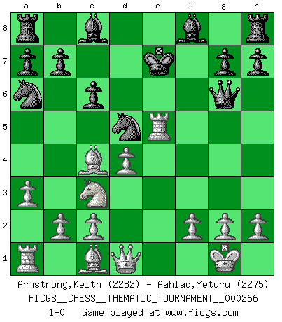 Last move : 1-0 2024 July 12 22:37:31 [Event "FICGS__CHESS__THEMATIC_TOURNAMENT__000266"] [Site "FICGS"] [Date "2024.06.15"] [Round "1"] [White "Armstrong,Keith"] [Black "Aahlad,Yeturu"] [Result "1-0"] [WhiteElo "2282"] [BlackElo "2275"] 1.e4 e5 2.Nf3 Nc6 3.Bc4 Nf6 4.Ng5 d5 5.exd5 Nxd5 6.Nxf7 Kxf7 7.Qf3+ Ke6 8.Nc3 Ncb4 9.O-O c6 10.d4 Qf6 11.Qd1 Ke7 12.Re1 Qg6 13.a3 Na6 14.Rxe5+ 1-0 Follow this game move after move (download)Some sacrifices are sound; the rest are mine. (Mikhail Tal) Woher wissen wir, daß der Neanderthaler Blindschach gespielt hat? -- Bei Ausgrabungen wurden keine Schachbretter und Figuren gefunden. (Anonymous) Una buena ofensiva y una buena defensa, comienzan ambas con un buen desarrollo. (Bruce A. Moon) Si je n'étais pas joueur d'échecs, je serais le meilleur dans quelque chose d'autre. (Anatoli Karpov) Art is the only way to run away without leaving home. (Twyla Tharp)