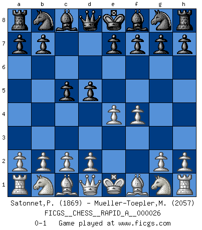 Last move : 0-1 2007 October 23 1:48:35 [Event "FICGS__CHESS__RAPID_A__000026"] [Site "FICGS"] [Date "2007.09.19"] [Round "1"] [White "Satonnet,Patrick"] [Black "Mueller-Toepler,Michael"] [Result "0-1"] [WhiteElo "1869"] [BlackElo "2057"] 1.e4 c5 2.f4 d5 0-1 This chess game has been lost on time (started : 2007.09.19 12:30:22) Sicilian : Grand Prix attack Player Black won this chess game. Follow this game move after move (download)Why must I lose to this idiot ? (Aron Nimzovich) Der Freibauer hat für mich eine Seele, genau wie der Mensch, Wünsche, die unerkannt in ihm schlummern, und Befürchtungen, von deren Existenz er selbst kaum ahnt. (Aaron Nimzowitsch) La vida es como un juego de Ajedrez, cambiando con cada movimiento. (Proverbio Chino) Psychologiquement, tu dois avoir confiance en toi même, mais cette confiance doit être basée sur des faits. (Robert Fischer) Perhaps the current trend of many chess professionals taking up the more lucrative pastime of poker is not a wholly negative one. It may not be too late for humans to relearn how to take risks in order to innovate and thereby maintain the advanced lifestyles we enjoy. And if it takes a poker-playing supercomputer to remind us that we can't enjoy the rewards without taking the risks, so be it. (The Chess Master and the Computer, by Garry Kasparov - 2010)