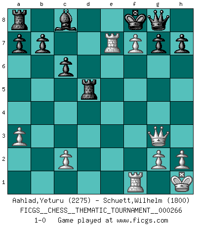 Last move : 1-0 2025 April 3 20:53:9 [Event "FICGS__CHESS__THEMATIC_TOURNAMENT__000266"] [Site "FICGS"] [Date "2024.06.15"] [Round "1"] [White "Aahlad,Yeturu"] [Black "Schuett,Wilhelm"] [Result "1-0"] [WhiteElo "2275"] [BlackElo "1800"] 1.e4 e5 2.Nf3 Nc6 3.Bc4 Nf6 4.Ng5 d5 5.exd5 Nxd5 6.Nxf7 Kxf7 7.Qf3+ Ke6 8.Nc3 Ncb4 9.O-O c6 10.d4 Qf6 11.Qe2 Kd7 12.dxe5 Qg6 13.a3 Nxc3 14.bxc3 Nd5 15.Bd3 Qe6 16.f4 Bc5+ 17.Kh1 Re8 18.c4 Nb6 19.Qd1 Kc7 20.f5 Qg8 21.e6 Bd6 22.c5 Bxc5 23.Bf4+ Bd6 24.Bxd6+ Kxd6 25.Qg4 Nd5 26.Qg3+ Ke7 27.Bc4 Rd8 28.Bxd5 Rxd5 29.f6+ Kxe6 30.Rae1+ Kf7 31.Re7+ Kf8 32.f7 1-0 Follow this game move after move (download)I am still a victim of Chess. It has all the beauty of art and much more. It cannot be commercialized. Chess is much purer than art in its social position. (Marcel Duchamp) Es ist peinlich, dass ich nie Weltmeister wurde. Es wäre leicht, Leonid Breschnjew als Ursache vorzuschieben, dessen Apparat den Vorzeigekommunisten Anatoli Karpow in allem unterstützte. Aber Garri Kasparow zum Beispiel, der ebenfalls von den Sowjets unerwünscht war, hat trotz der Widerstände den WM-Titel erobert. (Viktor Kortschnoi) No todos los artistas son jugadores de Ajedrez, pero todos los jugadores de Ajedrez son artistas. (Marcel Duchamp) Karpov est une pièce de musée. (Garry Kasparov) There's always a bigger fish. (Qui-Gon Jinn in Star Wars ep.1)