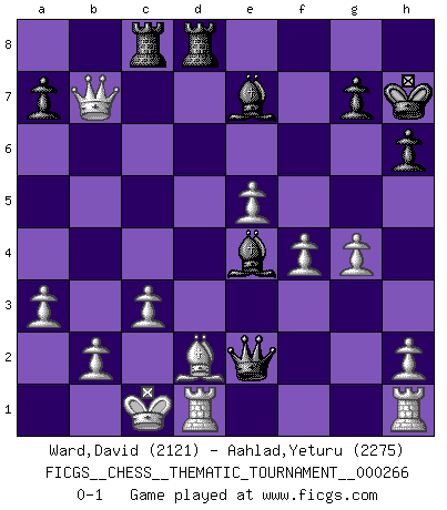 Last move : 0-1 2024 December 3 4:32:22 [Event "FICGS__CHESS__THEMATIC_TOURNAMENT__000266"] [Site "FICGS"] [Date "2024.06.15"] [Round "1"] [White "Ward,David"] [Black "Aahlad,Yeturu"] [Result "0-1"] [WhiteElo "2121"] [BlackElo "2275"] 1.e4 e5 2.Nf3 Nc6 3.Bc4 Nf6 4.Ng5 d5 5.exd5 Nxd5 6.Nxf7 Kxf7 7.Qf3+ Ke6 8.Nc3 Ncb4 9.Qe4 c6 10.a3 Na6 11.d4 Nac7 12.Bd2 Kf7 13.dxe5 Kg8 14.f4 Qh4+ 15.g3 Qh5 16.Qg2 Bh3 17.Qf2 Be7 18.Ne2 b5 19.Bb3 Ne6 20.O-O-O h6 21.Nd4 Nxd4 22.Qxd4 Kh7 23.Bxd5 cxd5 24.Qxd5 Rhd8 25.Qxb5 Bf5 26.Qb7 Rac8 27.c3 Qe2 28.g4 Be4 0-1 Follow this game move after move (download)If you aren't afraid of Spassky, then I have removed the element of money. (Jim Slater) Wie gewinnt Tal? Er entwickelt alle seine Figuren in die Brettmitte und opfert sie dann irgendwo. (Robert James Fischer) En el Ajedrez, tal como es jugado por los Maestros, practicamente la suerte es eliminada. (Emanuel Lasker) La vérité est comme le meilleur coup aux échecs : elle existe, mais il faut la chercher. (Arturo Perez-Reverte) I can't decide which is riskier; taking crazy risks, or taking advice on crazy risks from a crazy risk taker. (Gregory House in House M.D.)