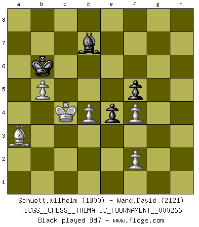 Last move : 1-0 2025 July 7 2:20:0 [Event "FICGS__CHESS__THEMATIC_TOURNAMENT__000266"] [Site "FICGS"] [Date "2024.06.15"] [Round "1"] [White "Schuett,Wilhelm"] [Black "Ward,David"] [Result "1-0"] [WhiteElo "1800"] [BlackElo "2121"] 1.e4 e5 2.Nf3 Nc6 3.Bc4 Nf6 4.Ng5 d5 5.exd5 Nxd5 6.Nxf7 Kxf7 7.Qf3+ Ke6 8.Nc3 Ncb4 9.a3 Nxc2+ 10.Kd1 c6 11.Kxc2 b5 12.Bxd5+ cxd5 13.Re1 Bb7 14.d4 e4 15.Qg4+ Kf7 16.Qf5+ Qf6 17.Qxf6+ gxf6 18.Nxb5 a6 19.Nc3 Rg8 20.g3 Rc8 21.Be3 Bd6 22.Kd2 h5 23.Ne2 Rc4 24.b3 Rc6 25.Bf4 Be7 26.Rec1 Rgc8 27.Rxc6 Rxc6 28.Bb8 Rc8 29.Ba7 Bd6 30.b4 h4 31.Bc5 Bc7 32.a4 Rh8 33.b5 hxg3 34.hxg3 Rh2 35.Ke3 f5 36.Rc1 Rh7 37.Nf4 Rh2 38.Ba7 Bxf4+ 39.gxf4 Rh3+ 40.Ke2 Kg6 41.Rc7 Rh7 42.Rxh7 Kxh7 43.Bc5 Kg6 44.Ba3 Kf7 45.Kd2 Ke6 46.Kc3 Kd7 47.Kb4 Kc7 48.Kc5 axb5 49.axb5 Bc8 50.Kxd5 Kb6 51.Kc4 Bd7 52.Bc5+ Kb7 53.b6 1-0 Follow this game move after move (download)Adequate compensation for a sacrifice is having a sound combination leading to a winning position; adequate compensation for a blunder is having your opponent snatch defeat from the jaws of victory. (Bruce A. Moon) Der Umstand, daß uns eine 7 Stunden Zeitkontrolle ermöglicht eine großartige, tiefe Partie zu spielen, ist für die Massenmedien nicht weiter von Bedeutung. (Alexej Shirov) El Ajedrez es el arte del análisis. (Mikhail Botvinnik) Le joueur d'Echecs qui veut atteindre le top est obligé de développer son propre credo créatif. Alexeï Stepanovicth Souétine. Il est facile d'écrire des livres ! Ce qui est difficile, c'est de jouer ! (Alexeï Stepanovicth Souétine) Programming can only do so much before it becomes too much. (Don Groves)