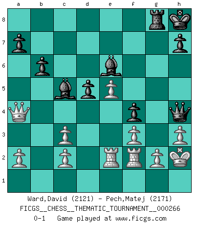 Last move : 0-1 2025 March 22 15:4:3 [Event "FICGS__CHESS__THEMATIC_TOURNAMENT__000266"] [Site "FICGS"] [Date "2024.06.15"] [Round "1"] [White "Ward,David"] [Black "Pech,Matej"] [Result "0-1"] [WhiteElo "2121"] [BlackElo "2171"] 1.e4 e5 2.Nf3 Nc6 3.Bc4 Nf6 4.Ng5 d5 5.exd5 Nxd5 6.Nxf7 Kxf7 7.Qf3+ Ke6 8.Nc3 Ncb4 9.O-O c6 10.d4 Qf6 11.Qe4 Kf7 12.dxe5 Qg6 13.f3 Be6 14.Bb3 Nxc3 15.bxc3 Nd5 16.Bd2 Bc5+ 17.Kh1 Rad8 18.Rae1 Rhf8 19.Qe2 Kg8 20.h3 Qh5 21.Kh2 g5 22.Qe4 Kh8 23.Qc4 b6 24.Qe4 Qh6 25.Re2 Rf4 26.Bxf4 gxf4 27.Bxd5 cxd5 28.Qa4 Rg8 29.R1f2 Qh4 0-1 Follow this game move after move (download)I won't play with you anymore. You have insulted my friend. - When an opponent cursed himself for a blunder. (Miguel Najdorf) Karpov ist ein Museumsstück. (Garry Kasparov) EL Ajedrez es como la vida. (Boris Spassky) Echiquier : carré parfait, comme la Jérusalem nouvelle décrite par l'auteur de l'Apocalypse, huit cases sur huit, exaltation du chiffre 4, symbole du cosmos aux quatre horizons... où le noir et le blanc, l'ombre et la lumière, le mal et le bien s'entremêlent et se conjuguent. (Robert Couffignal, Le Gambit du poète) Inventor: A person who makes an ingenious arrangement of wheels, levers and springs, and believes it civilization. (Ambrose Bierce, The Devil's Dictionary)
