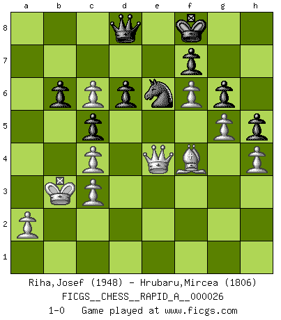 Last move : 1-0 2008 January 2 1:11:10 [Event "FICGS__CHESS__RAPID_A__000026"] [Site "FICGS"] [Date "2007.09.19"] [Round "1"] [White "Riha,Josef"] [Black "Hrubaru,Mircea"] [Result "1-0"] [WhiteElo "1948"] [BlackElo "1806"] 1.d4 Nf6 2.c4 e6 3.Nc3 Bb4 4.e3 c5 5.Bd3 Nc6 6.Nf3 Bxc3+ 7.bxc3 d6 8.O-O e5 9.d5 Ne7 10.Qc2 O-O 11.Ng5 Ng6 12.f4 exf4 13.exf4 Re8 14.Bd2 Bd7 15.Rfe1 Qb6 16.Nf3 Qc7 17.f5 Ne5 18.Nxe5 Rxe5 19.Bf4 Rxe1+ 20.Rxe1 Re8 21.Rxe8+ Bxe8 22.Qe2 Ba4 23.g4 Qd7 24.g5 Ne8 25.Kg2 g6 26.f6 Kf8 27.Qf3 Qd8 28.Qe4 h5 29.Bg3 Bd1 30.Qe1 Bg4 31.Qe3 b6 32.Bc2 Bd7 33.Bf4 Bg4 34.Ba4 Bd7 35.Bc6 Bxc6 36.dxc6 Qc7 37.Qe4 Qd8 38.Kf3 Nc7 39.Ke3 Ne8 40.Kd2 Qc7 41.Kc2 Qd8 42.Kb2 Qc7 43.Kb3 Qd8 44.Bg3 Qc7 45.Ka4 Qd8 46.h4 Qc7 47.Kb5 a6+ 48.Kxa6 Qc8+ 49.Kb5 Nc7+ 50.Ka4 Qd8 51.Bf4 Ne6 52.Kb3 1-0 Nimzo-Indian : e3, Huebner variation Kingside Castling by player White (move 8) Kingside Castling by player Black (move 10) Player White won this chess game. Follow this game move after move (download)The hallmark of the artist is simplicity. (Larry Evans) Den Ruhm habe ich schon, jetzt brauche ich noch das Geld. (Wilhelm Steinitz) El Ajedrez es el gimnasio de la mente. (Blaise Pascal) Les échecs sont plus proches de l'art de l'assassinat que de l'art de la guerre. (Arturo Perez-Reverte) I live to kill Traxler counterattack. (Ilmars Cirulis)