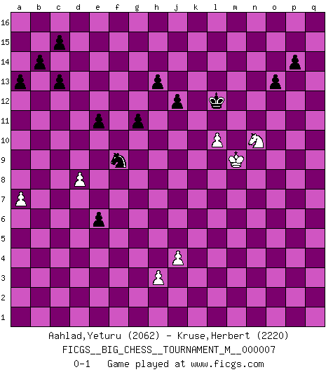 Last move : 0-1 2025 February 27 21:0:11 [Event "FICGS__BIG_CHESS__TOURNAMENT_M__000007"] [Site "FICGS"] [Date "2024.06.21"] [Round "1"] [White "Aahlad,Yeturu"] [Black "Kruse,Herbert"] [Result "0-1"] [WhiteElo "2062"] [BlackElo "2220"] 1.j2-k4 p16-o14 2.m2-m4 j15-k13 3.h1-o7 h15-g13 4.l1-p5 k16-h15 5.e2-e4 h16-p9 6.p1-o3 e15-e13 7.h2-g4 m15-m13 8.b1-c3 b16-c14 9.d2-d4 l16-p12 10.c1-l9 p12-m9 11.o7-j7 g16-j15 12.l9-n11 p9-p12 13.n2-n4 f16-b12 14.f1-b5 m9-j12 15.o1-j6 p12-l12 16.m1-m3 j12-b5 17.c3-b5 l12-j12 18.j7-j12 g13-j12 19.j6-c12 h15-g13 20.o3-n5 d15-d14 21.e1-e3 c16-e14 22.c12-d11 e13-e12 23.d11-g8 n15-n14 24.n11-o12 o16-m14 25.p5-l9 e14-h11 26.a2-a4 e16-e13 27.m3-p3 o14-q13 28.o12-n11 p15-p14 29.q1-m1 q16-n16 30.k1-l3 m14-f8 31.p3-p7 e13-c13 32.c2-c4 j12-h10 33.g8-h9 c13-c9 34.h9-e6 a16-e16 35.m1-m3 h11-j12 36.m3-o3 o15-o13 37.c4-c5 j12-k11 38.e6-k11 h10-k11 39.l9-h6 f8-h6 40.n11-h6 b12-h6 41.g4-h6 m16-m14 42.o3-o7 e16-e13 43.o7-b7 b15-b14 44.e3-f3 m14-l14 45.f3-f7 n14-n13 46.f7-c7 e13-c13 47.c7-c9 c13-c9 48.p7-c7 l14-l9 49.a1-a3 j16-h15 50.a3-f3 c9-c13 51.c7-c13 d14-c13 52.f3-f7 n16-d16 53.q2-q4 n13-n12 54.b5-d6 k13-h12 55.g1-f3 j15-k13 56.l3-k5 f15-f14 57.f3-g5 d16-d10 58.q4-q5 c14-d12 59.b2-b4 a15-a13 60.a4-a5 l15-l14 61.h6-j8 l9-p9 62.p2-p4 g13-f11 63.k5-h6 f14-f13 64.f2-f4 g15-g13 65.k4-l6 p9-p10 66.g5-j6 h15-g14 67.n5-p6 k13-m12 68.b4-b5 g13-g12 69.a5-a6 h14-h13 70.d4-d5 g14-g13 71.b5-b6 j14-j13 72.a6-a7 j13-j12 73.k2-k4 f11-h10 74.b7-d7 h10-j8 75.h6-j8 h12-f11 76.d6-e8 d10-d7 77.f7-d7 p10-j10 78.j8-g7 k15-k13 79.d7-d9 j10-j9 80.d9-j9 k11-j9 81.l6-m8 q13-p11 82.p6-o8 f11-e9 83.e8-c9 j9-g8 84.e4-e5 g8-e7 85.d5-d6 e7-d5 86.g2-g3 d5-c3 87.b6-b7 c3-e4 88.c5-c6 e4-g3 89.j6-g5 g3-e2 90.g7-e6 e2-g3 91.e6-g7 e9-g8 92.j1-h2 g3-e2 93.g7-e6 g8-h6 94.j3-j4 h6-f5 95.g5-f3 f13-f12 96.h2-g2 f12-f11 97.o8-m7 e2-g3 98.f3-g1 p11-n10 99.m8-n10 m12-n10 100.m7-k8 n10-m8 101.m4-m5 m8-o7 102.k8-l10 l14-l13 103.l10-n11 m13-m12 104.n11-m13 o7-m6 105.n4-n5 m6-l4 106.m13-l15 l4-n5 107.l15-k13 n5-p4 108.k13-l15 p4-o2 109.l15-n14 o2-n4 110.n14-l13 n4-o6 111.l13-n14 o6-q5 112.n14-m12 q5-o4 113.m5-m6 o4-m5 114.k4-k5 m5-n3 115.l2-l3 n3-l4 116.m12-n14 l4-m6 117.n14-o16 n12-n11 118.o16-q15 n11-n10 119.q15-p13 n10-n9 120.p13-o11 n9-n8 121.o11-n9 n8-n7 122.n9-m7 m6-l4 123.m7-o8 l4-j3 124.g2-f3 g3-h1 125.g1-j2 f5-h6 126.e6-g5 h6-k7 127.o8-n6 j3-l4 128.j2-k4 l4-m6 129.k4-m5 m6-o5 130.l3-l4 h1-k2 131.l4-l5 k2-m3 132.l5-l6 k7-l5 133.m5-l7 l5-n6 134.l7-n6 m3-k4 135.g5-j6 k4-j6 136.k5-j6 g13-h12 137.f3-g4 h12-j11 138.g4-h5 d12-e10 139.c9-e8 e12-e11 140.h5-j5 e10-f8 141.f4-f5 o5-m6 142.j5-k4 f8-h9 143.k4-l5 f11-f10 144.l6-l7 f10-f9 145.e8-g9 h9-g7 146.j6-j7 g7-f5 147.l5-l6 f5-d4 148.l6-m7 m6-o5 149.n6-m8 d4-c6 150.e5-e6 c6-d8 151.e6-e7 d8-b7 152.d6-d7 b7-c9 153.d7-d8 c9-e8 154.g9-e8 f9-e8 155.m7-n6 o5-n3 156.l7-l8 j11-k10 157.m8-n10 g12-g11 158.n6-n7 n3-m5 159.n7-m8 k10-l10 160.m8-n9 m5-n7 161.n9-m8 n7-l6 162.m8-n9 l6-j7 163.l8-l9 j7-g8 164.n9-m8 g8-e7 165.m8-l8 e7-f9 166.n10-m8 l10-k11 167.l9-l10 k11-l12 168.l8-m9 e8-e7 169.m8-n10 e7-e6 0-1 Follow this game move after move (download)Fischer was a master of clarity and a king of artful positioning. His opponents would see where he was going but were powerless to stop him. (Bruce Pandolfini) Jeder Fehler erscheint unglaublich dumm, wenn andre ihn begehen. (Georg Christoph Lichtenberg) El Ajedrez es el arte del análisis. (Mikhail Botvinnik) Votre prénom est 'Tactique', votre deuxième prénom est 'Tactique' et votre nom est 'Tactique'. (Ken Smith) You can think I'm wrong, but that's no reason to quit thinking. (Gregory House, House M.D.)