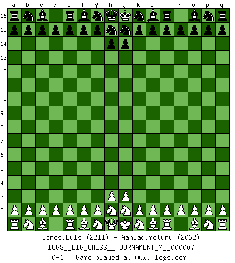 Last move : 0-1 2024 July 21 23:2:9 [Event "FICGS__BIG_CHESS__TOURNAMENT_M__000007"] [Site "FICGS"] [Date "2024.06.21"] [Round "1"] [White "Flores,Luis"] [Black "Aahlad,Yeturu"] [Result "0-1"] [WhiteElo "2211"] [BlackElo "2062"] 0-1 This big chess game has been lost on time (started : 2024.06.21 15:37:56) Follow this game move after move (download)When you play Bobby, it is not a question if you win or lose. It is a question if you survive. (Boris Spassky) Der Vorposten provoziert a) eine Basis für neue Angriffe und b) eine Schwächung der gegnerischen Widerstandskraft in der fraglichen Linie. (Aaron Nimzowitsch) Yo jugué Ajedrez con el y a veces le pude haber ganado solo que siempre devuelve su última jugada y juega la partida de manera diferente. (Mark Twain) Mais l'homme est une créature légère et illogique : semblable au joueur d'échecs, il n'aime que le processus du but à atteindre, non le but lui-même. (Dostoïevsky) A generalist learns less and less about more and more until he knows nothing about everything. (Author unknown)