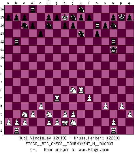 Last move : 0-1 2024 October 30 12:36:45 [Event "FICGS__BIG_CHESS__TOURNAMENT_M__000007"] [Site "FICGS"] [Date "2024.06.21"] [Round "1"] [White "Hybl,Vladislav"] [Black "Kruse,Herbert"] [Result "0-1"] [WhiteElo "2013"] [BlackElo "2220"] 1.j2-k4 p16-o14 2.m2-m4 j15-k13 3.h2-g4 h16-o10 4.p1-o3 m15-m13 5.b1-c3 l16-p12 6.k1-h2 e15-e13 7.e2-e4 f16-b12 8.f1-c4 n15-n14 9.d2-d3 o16-f8 10.g1-j2 b16-c14 11.n2-n4 d15-d14 12.o1-j6 p12-j6 13.k4-j6 c16-p4 14.m1-m3 m16-m14 15.q2-q3 p4-j10 16.c4-j10 o10-j10 17.j2-h4 m14-l14 18.l2-l4 e16-e14 19.l1-m2 f8-m2 20.o3-m2 e14-f14 21.l4-l5 l14-l12 22.h2-f3 l12-p12 23.p2-p4 q16-m16 24.c1-h6 b12-h6 25.g4-h6 j10-b10 26.a1-b1 m16-m14 27.h1-n6 a16-d16 28.m3-k3 g16-j15 29.k3-k5 b10-m10 30.k5-b5 m10-h6 31.n6-q6 p12-b12 32.b5-g5 f14-g14 33.g5-f5 h15-f14 34.q1-l1 g14-g12 35.q6-p6 h6-m2 36.l1-o1 m2-m3 37.j1-j2 m3-l4 38.j2-h2 l4-m4 39.p6-p15 m4-k2 40.h4-j2 g12-o12 41.e1-k1 k2-o6 42.k1-k6 o6-o11 43.f5-g5 j16-h15 0-1 Follow this game move after move (download)No other master has such a terrific will to win. At the board he radiates danger, and even the strongest opponents tend to freeze, like rabbits when they smell a panther. Even his weaknesses are dangerous. As white, his opening game is predictable - you can make plans against it - but so strong that your plans almost never work. In the middle game his precision and invention are fabulous, and in the end game you simply cannot beat him. (Anonymous German Expert) Der beste Spieler in einem Turnier gewinnt es nie. Er landet auf Platz zwei oder drei. (Siegbert Tarrasch) Si yo gano un torneo, yo lo gano por mí mismo. Yo hago las jugadas. Nadie me ayuda. (Bobby Fischer) Même si vous avez un bon coup à faire, regardez toujours s'il n'y en a pas un qui lui soit préférable. (Pedro Damiano) A good teacher is like a candle - it consumes itself to light the way for others. (Author unknown)